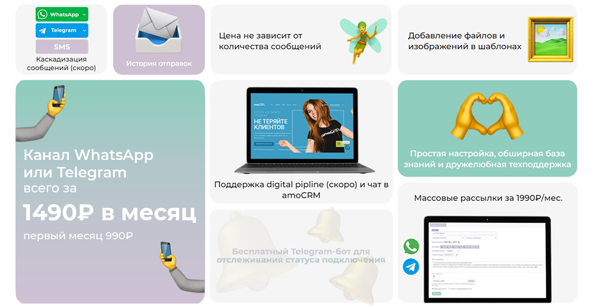 - WhatsApp + Telegram - получение сообщений в открытой линии и каскадная отправка сообщений в WhatsApp и Telegram - 2490₽