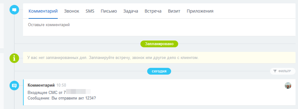 При поступлении входящего СМС-сообщения в Twilio приложение ищет в вашей CRM контакт или сделку с этим номером телефона и добавляет текст сообщения в ленту событий. Ответственный пользователь получает уведомление о новом сообщении.