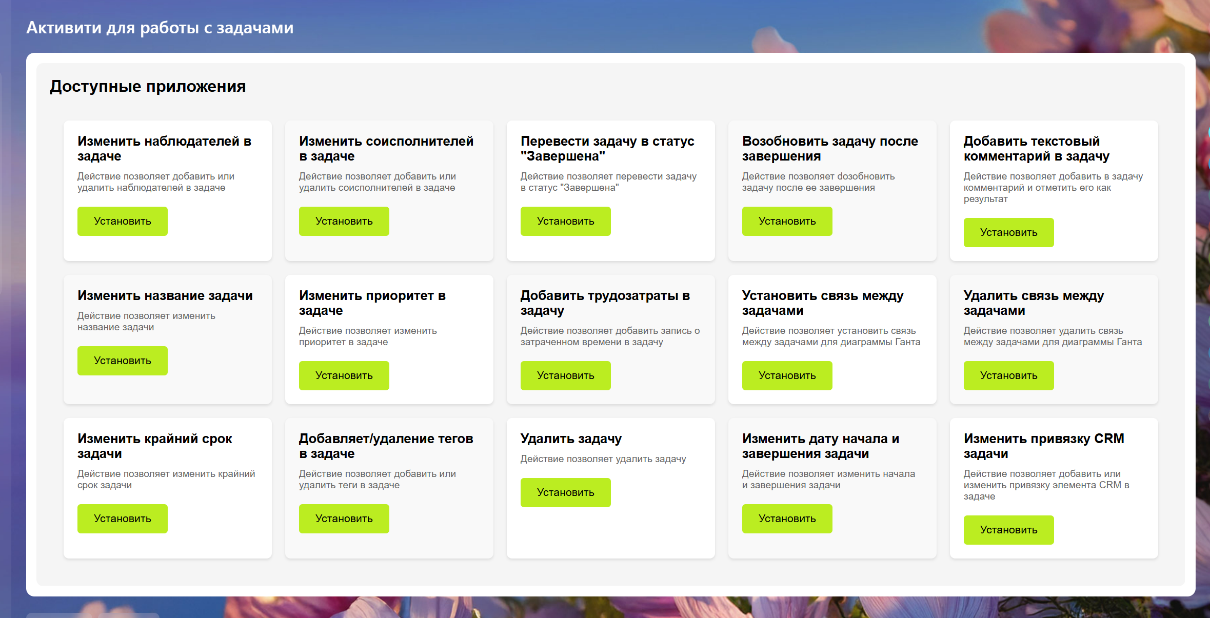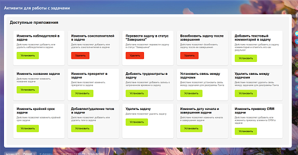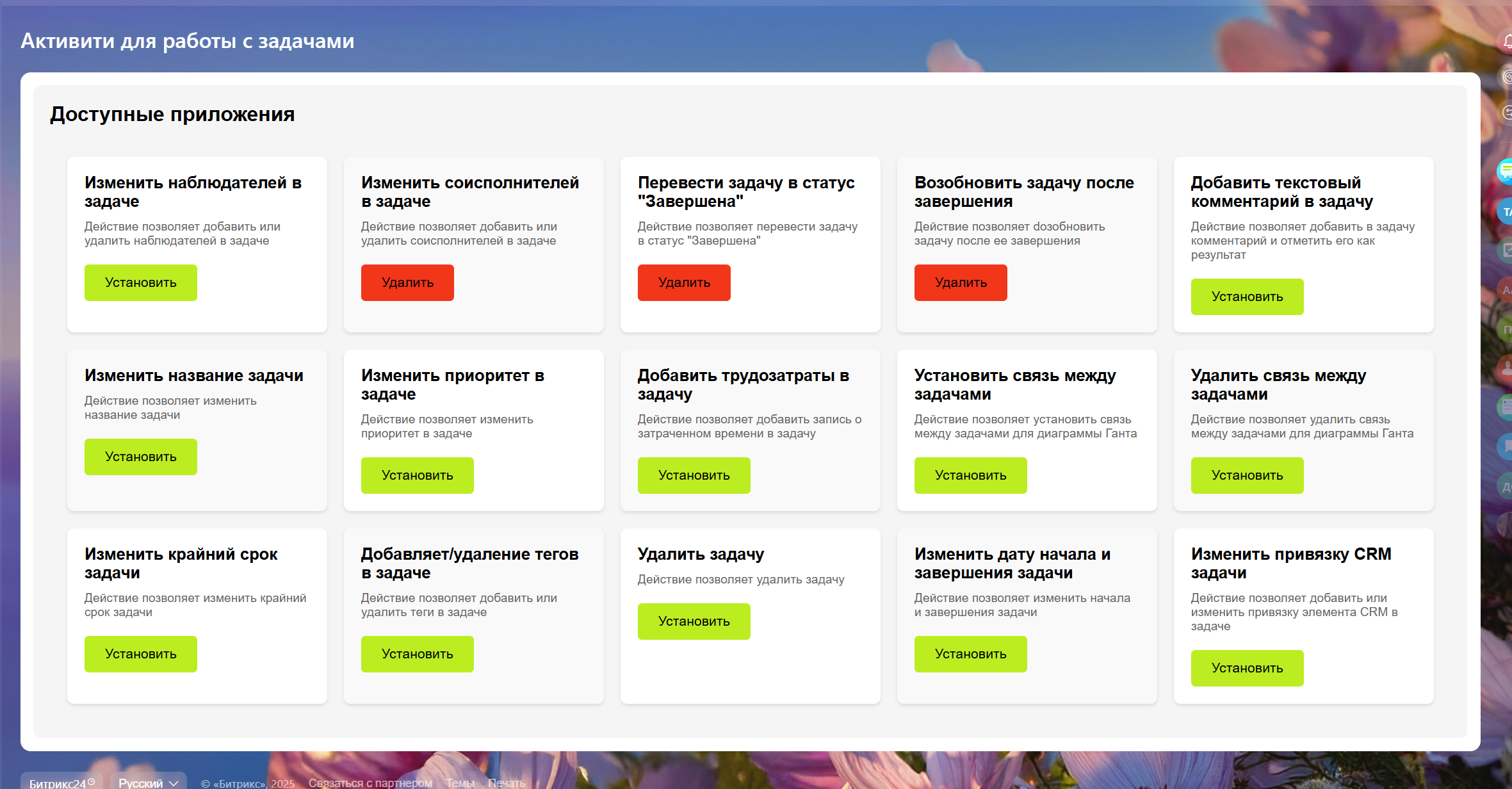 При масштабировании бизнес-процессов компании часто возникает потребность в расширенной обработке задач. Стандартный функционал Битрикс24 не всегда предоставляет необходимый инструментарий для решения специфических задач бизнеса. В ответ на эту потребность мы разработали специализированный набор активити, включающий наиболее востребованные операции.