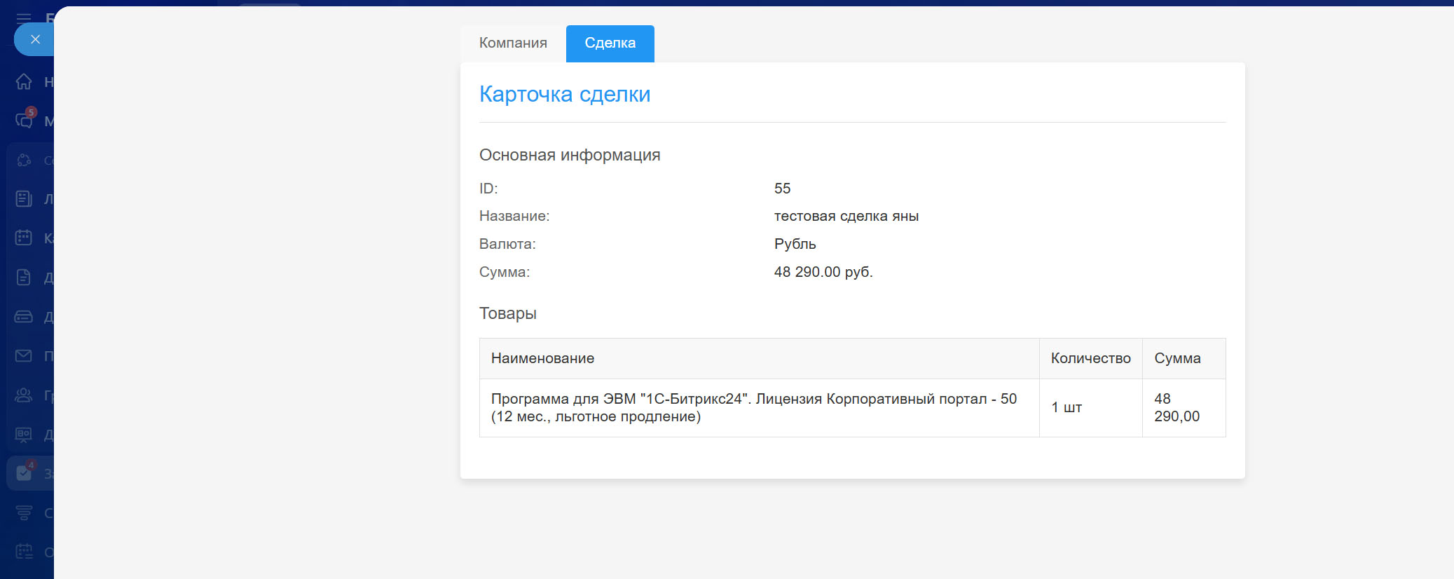 - Актуальность данных — информация обновляется автоматически при изменении в CRM.