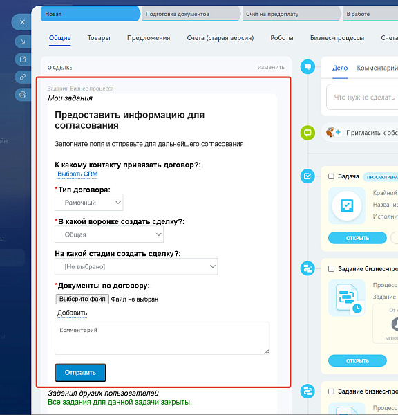 Выполняйте задания прямо в карточке CRM. Все задания по бизнес-процессам доступны прямо в карточках CRM, что позволяет существенно повысить эффективность работы вашей команды.