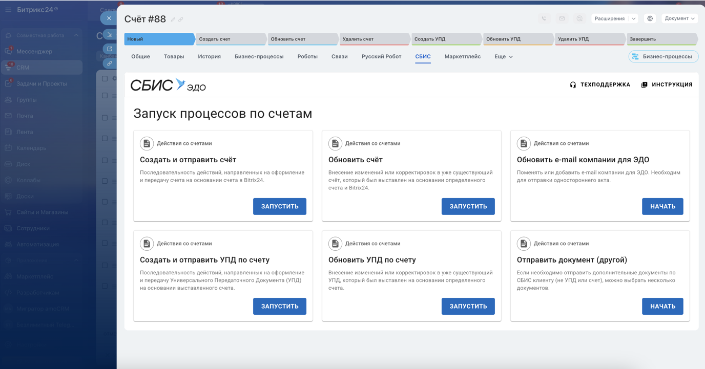 Автоматизация ЭДО: Позволяет менеджерам по продажам и другим сотрудникам работать с документами напрямую из карточки сделки или счета в Битрикс24, без доступа к СБИС.