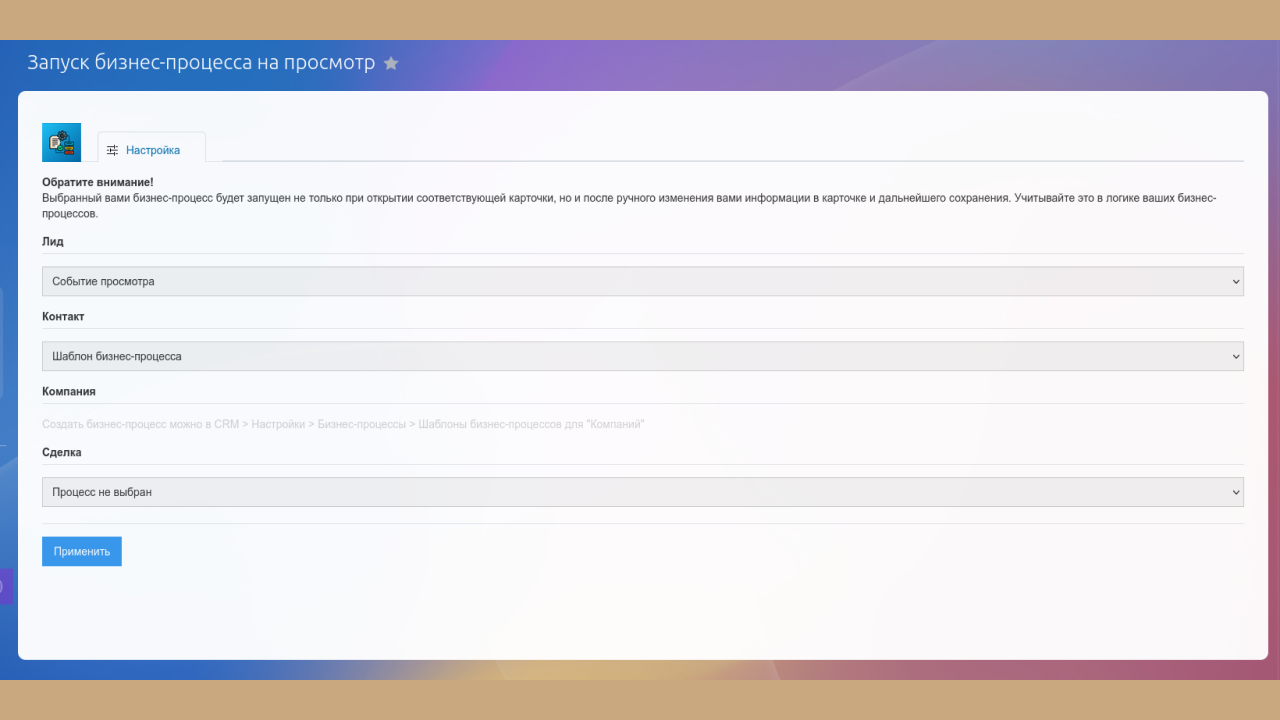 Приложение запустит бизнес-процесс при просмотре карточек сделки, лида, компании и контакта