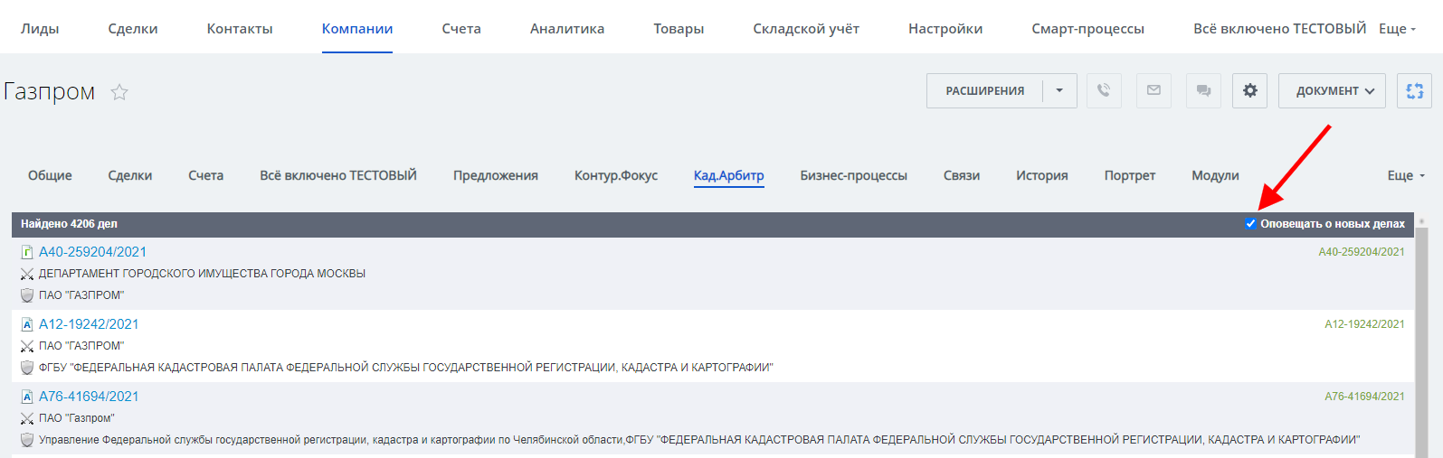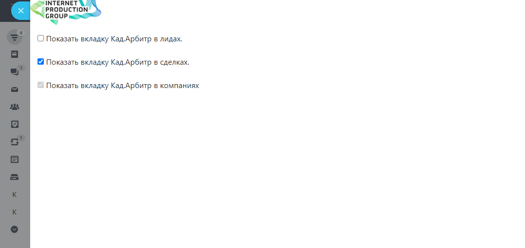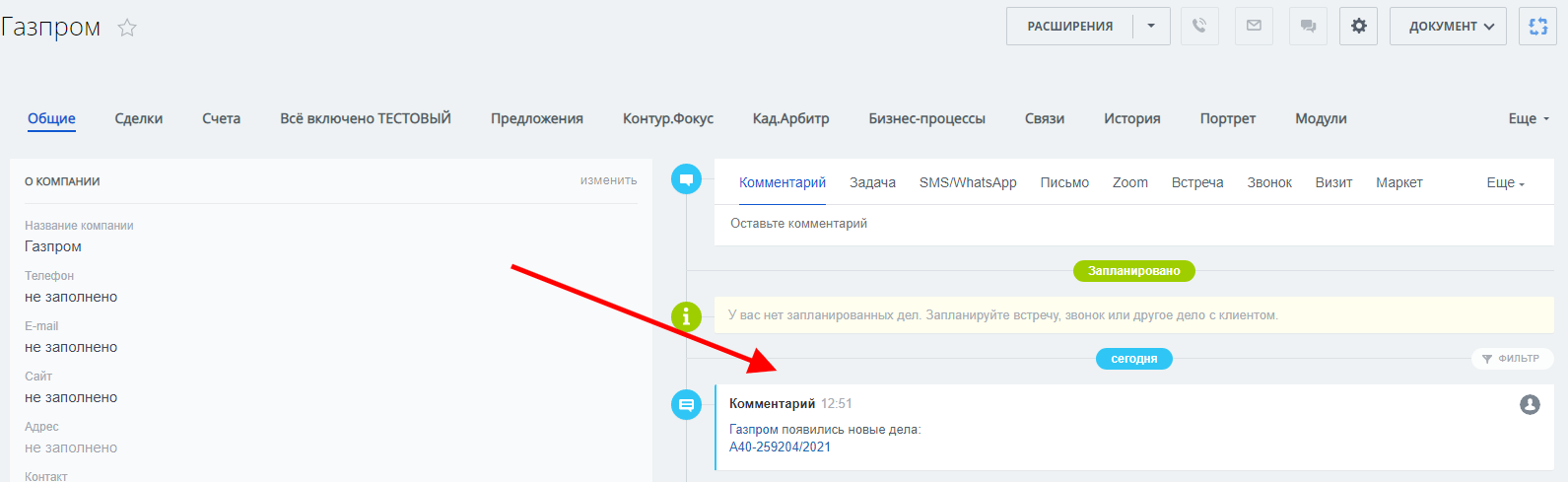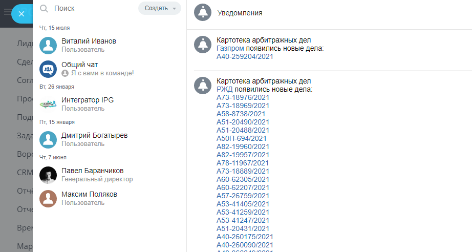 Арбитраж - приложение представляет собой интегрированную в CRM версию информационной системы «Картотека Арбитражных Дел» Высшего Арбитражного Суда Российской Федерации. С помощью него вы можете получить актуальную информацию о делах, рассматриваемых в арбитражных судах Российской Федерации по компании, прямо у вас в CRM. Пользователю доступна полная хронология рассмотрения дела во всех инстанциях: