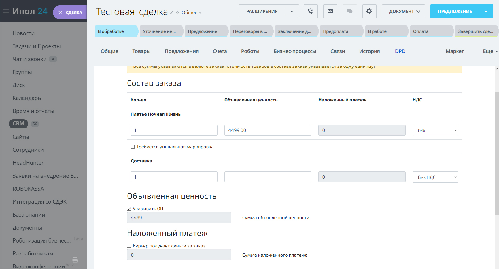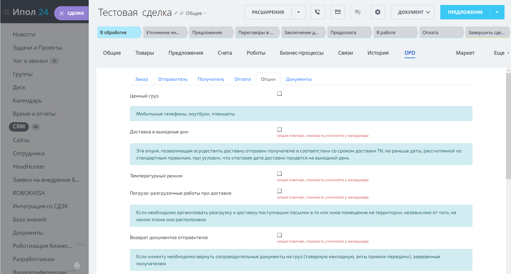 Установите модуль DPD и оформляйте заказы одной кнопкой прямо из сделки Битрикс24