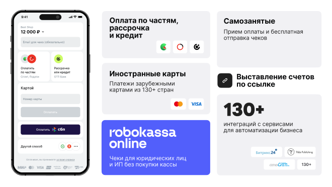 Robokassa (Робокасса) – ведущий сервис по приему онлайн-платежей, более 20 лет предлагающий максимально широкий спектр возможностей для оплаты товаров и услуг.На текущий момент сервис работает с юридическими лицами, индивидуальными предпринимателями и самозанятыми, зарегистрированными на территории РФ и Казахстана.