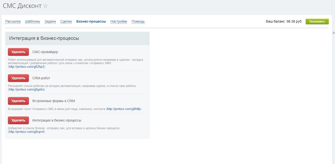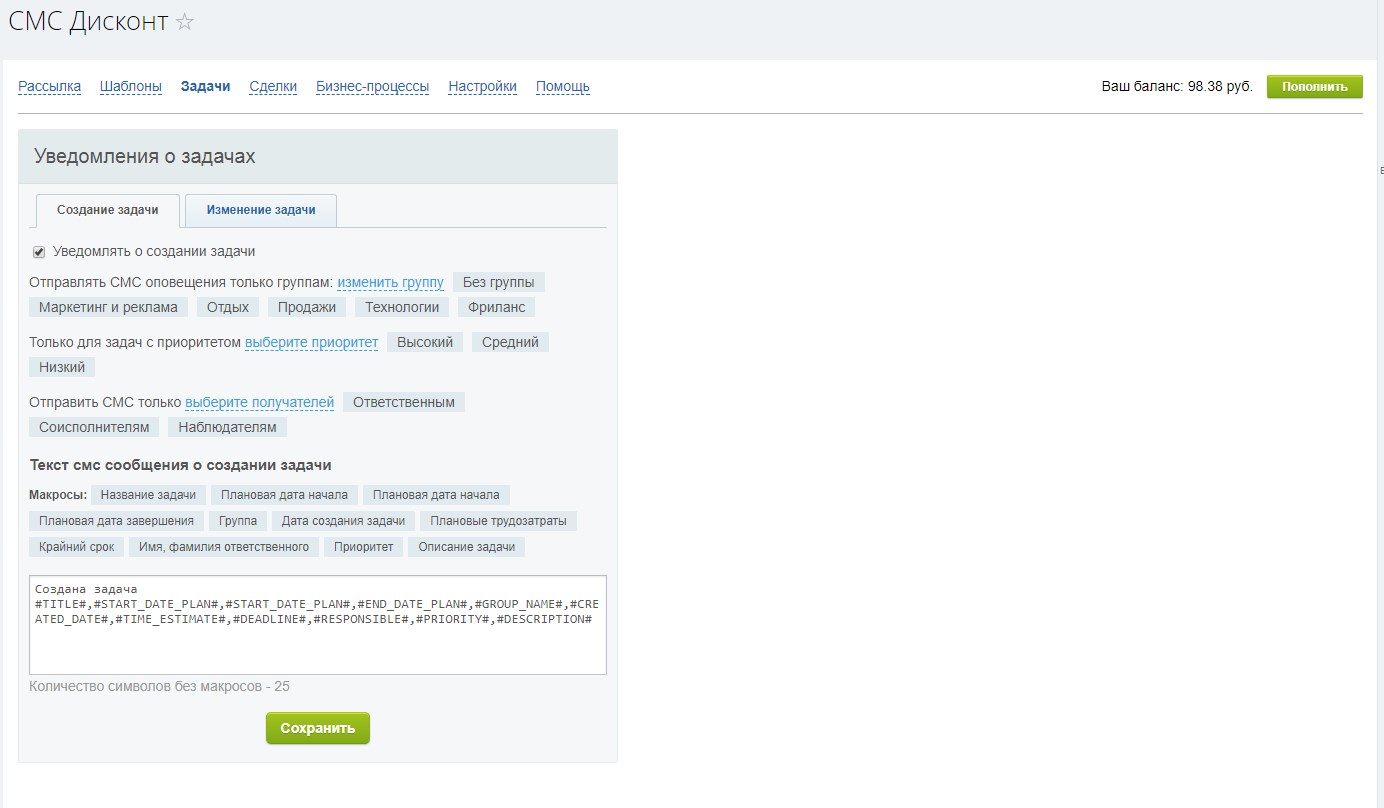 7. Отправка SMS при создании и изменении статуса задач:8. Отправка SMS в сделках. Об изменении статуса сделки.