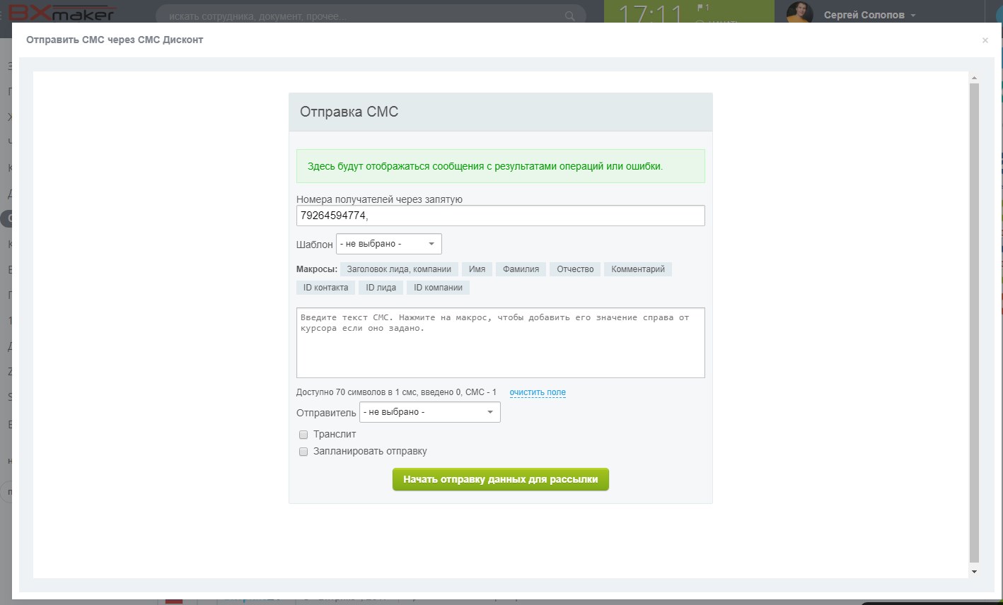 6. Отправка SMS из бизнес-процессов контакту, лиду, сотруднику или на произвольный номер.