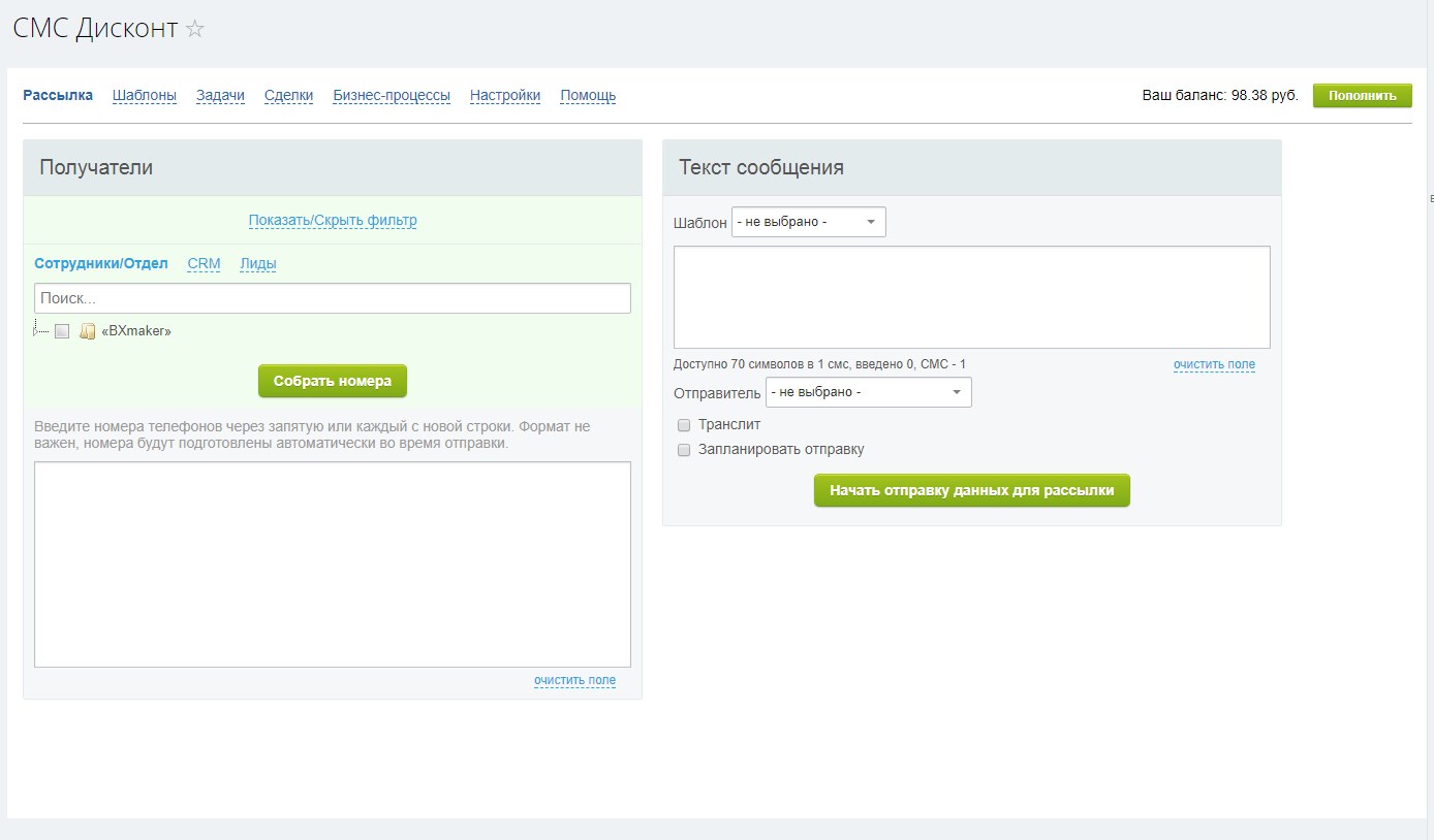 Модуль производит одиночные и массовые СМС рассылки на номера из базы (сотрудникам, контактам, лидам). Так же есть возможность отправки на произвольные номера, скопированные в текстовое поле.