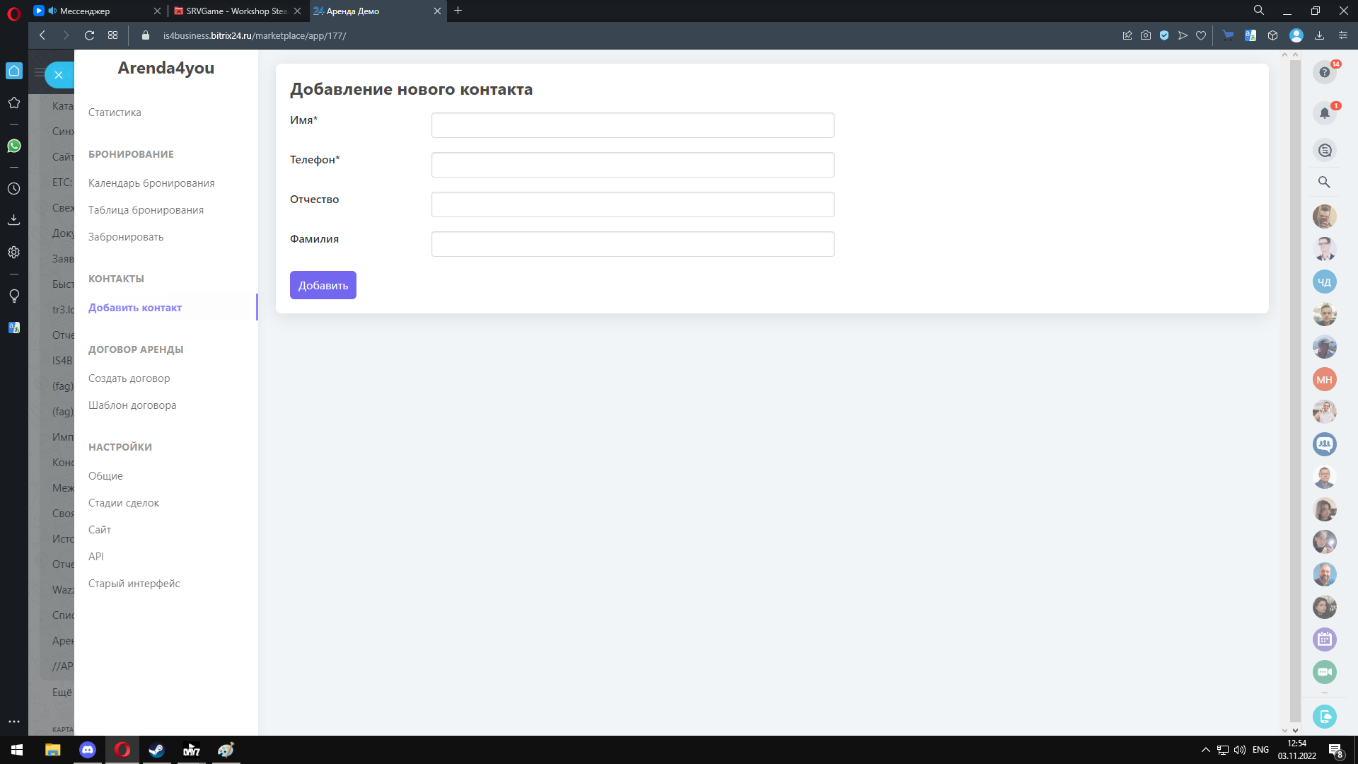 2. На вкладке «Бронь» укажите даты и выберите клиента из контактов