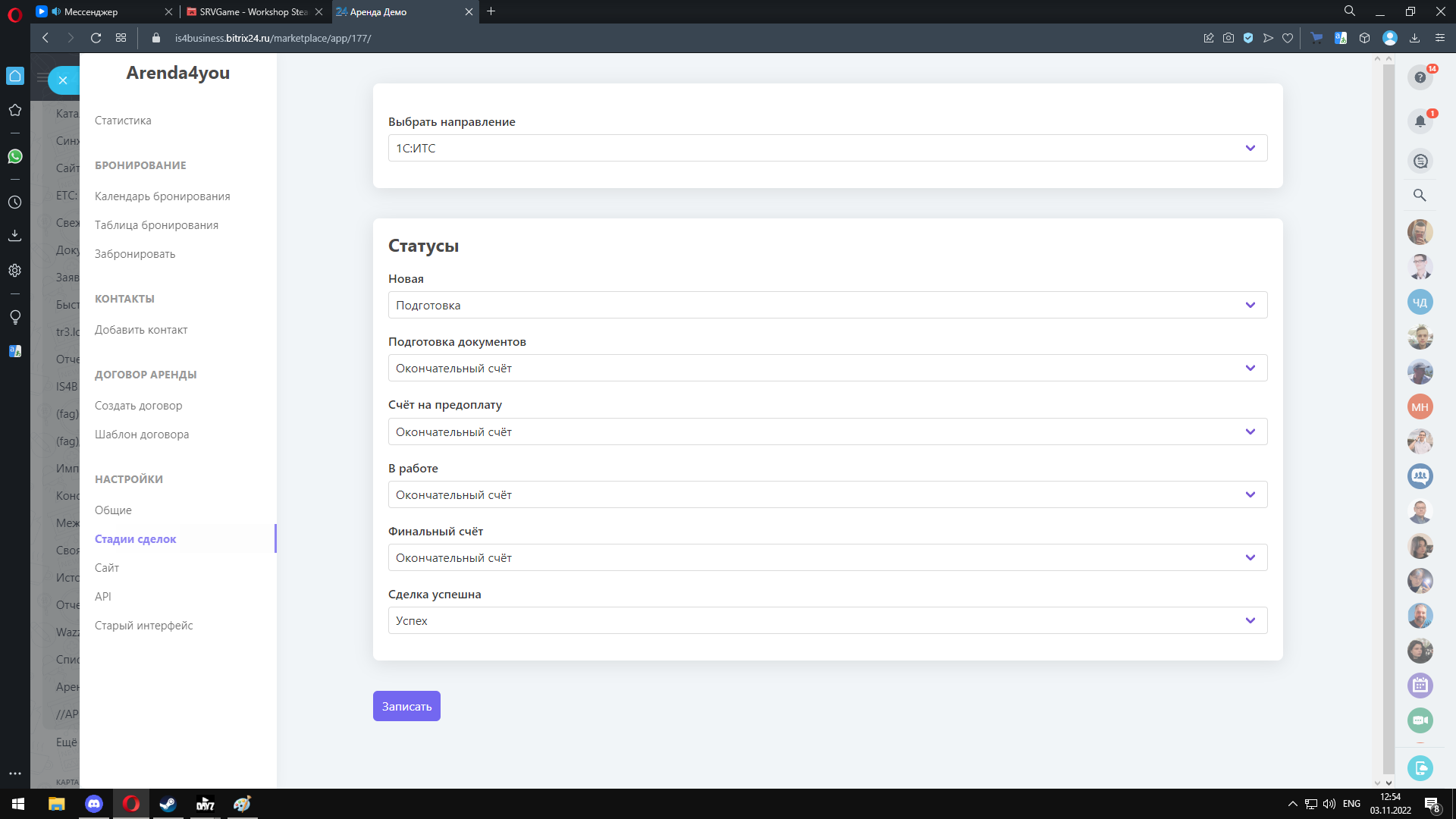 • «Настройки/Сайт» разворачивает Б24-сайт с CRM формой для приёма заявок. Его можно отредактировать под свою компанию, опубликовать, привязать домен. Сайт отображает ваш реальный каталог товаров и даёт возможность аренды с сайта