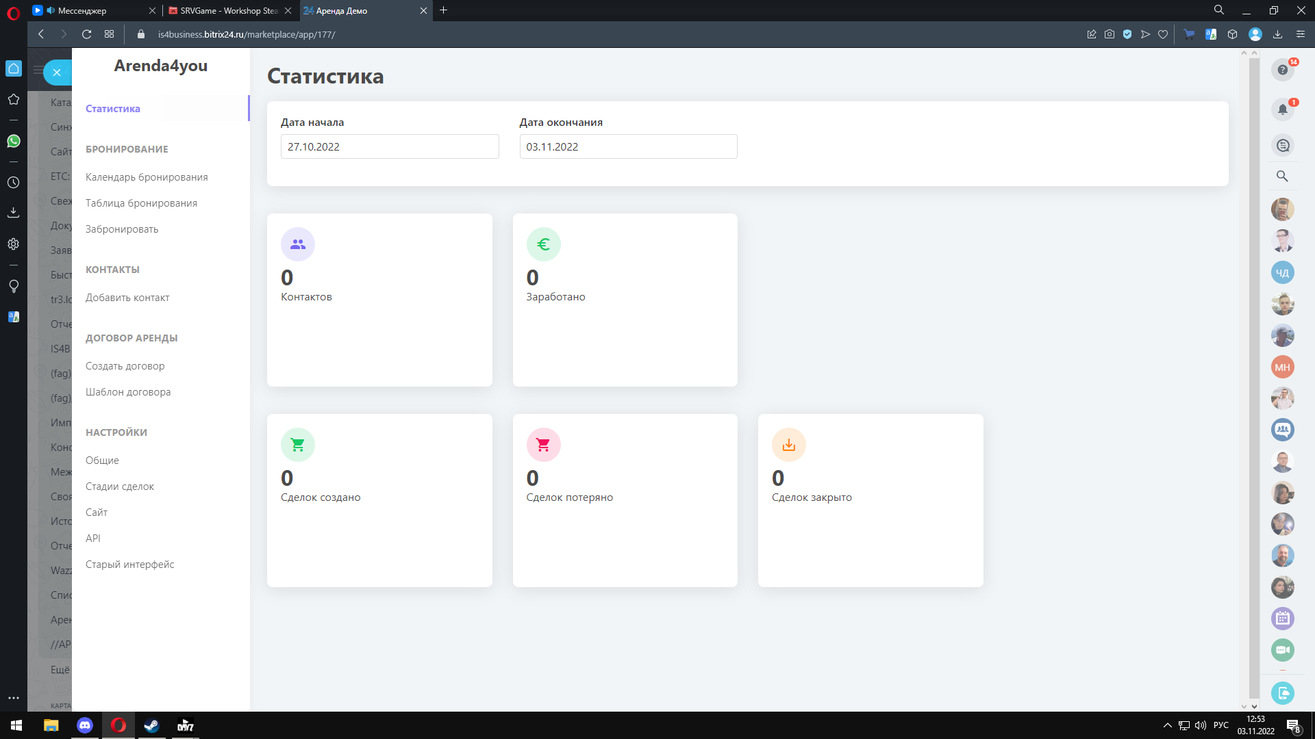• «Настройки/Сайт» разворачивает Б24-сайт с CRM формой для приёма заявок. Его можно отредактировать под свою компанию, опубликовать, привязать домен. Сайт отображает ваш реальный каталог товаров и даёт возможность аренды с сайта