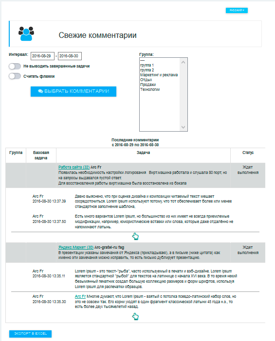 Приложение выводит комментарии к задачам из выбранных групп за указанный период, по умолчанию сегодняшний и вчерашний дни. Это удобно для отслеживания активности в задачах проектов, в случае когда выполняется много задач разными исполнителями. Не заглядывая в каждую задачу отдельно мы получаем общую картину в одном документе. Есть экспорт для Excell.