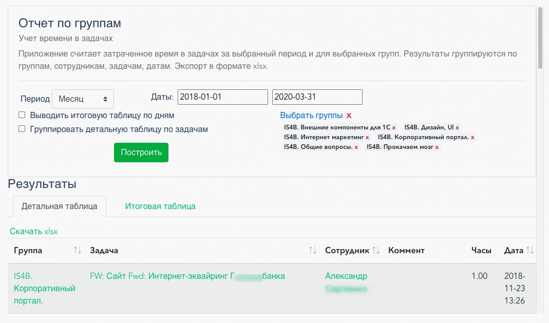 Данное приложение строит отчеты о затраченном времени в задачах, в разрезе групп/задач/сотрудников.