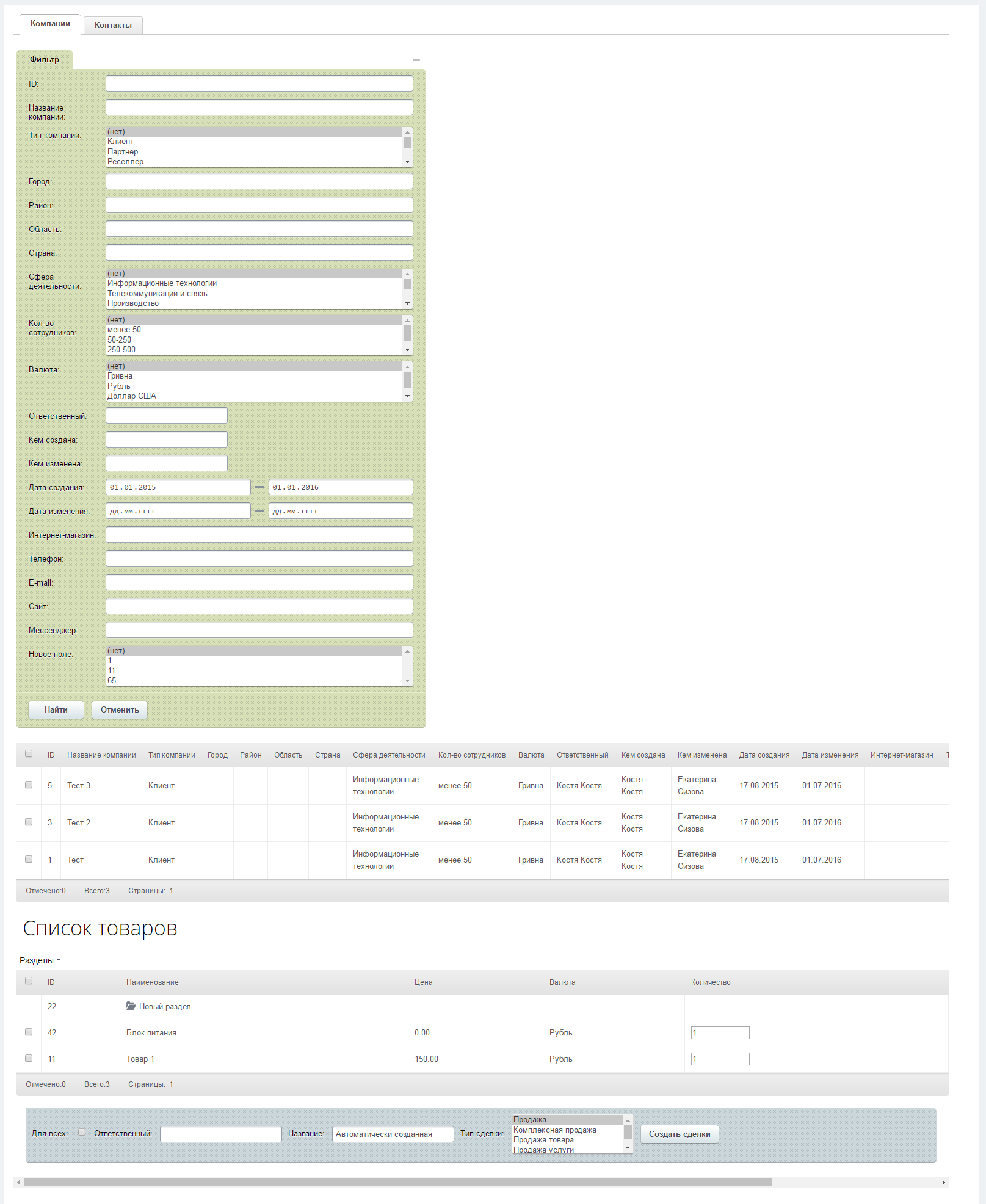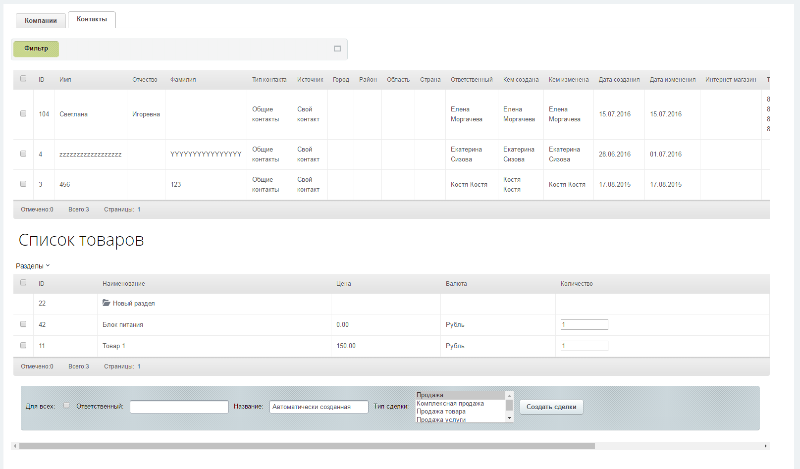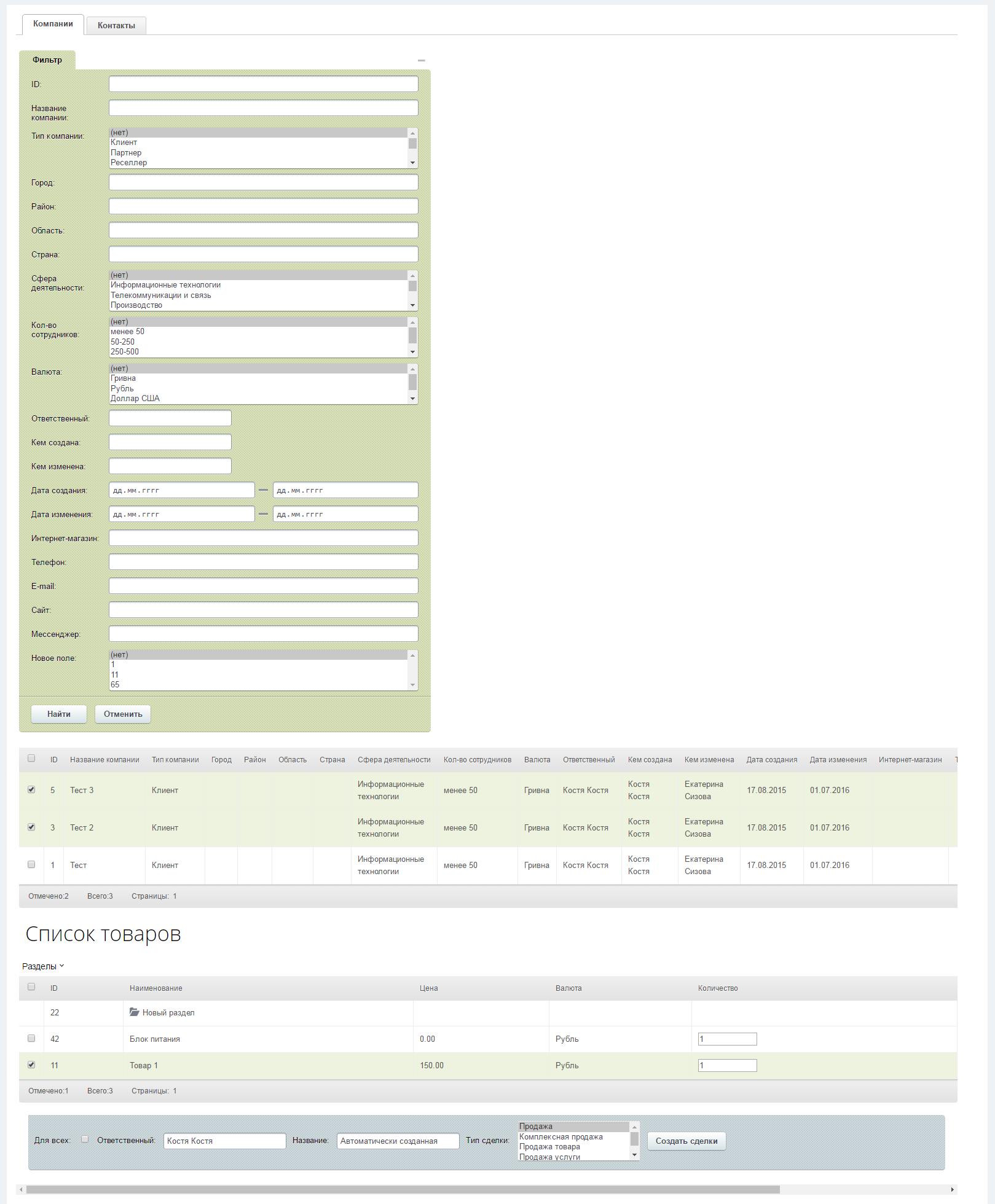 Переключайтесь по вкладкам компании/контакты, фильтруйте и отмечайте нужные данные, выбирайте товары, ответственного и запускайте потоковое создание сделок для отмеченных компаний или контактов соответственно с выбранными параметрами.