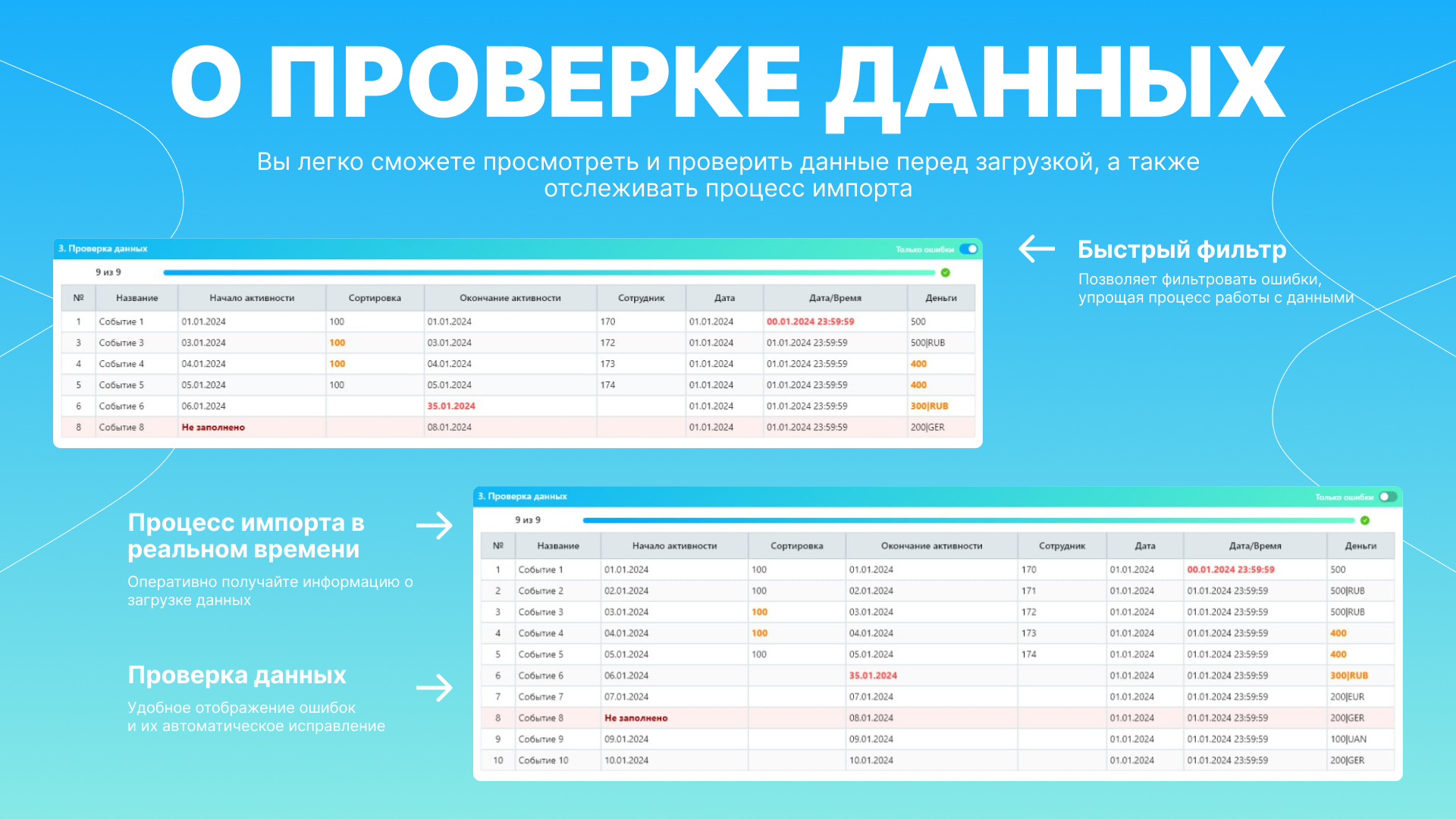После загрузки файла перед вами появится таблица для предварительного просмотра данных файла. В зависимости от типа поля система проверит данные на корректность.