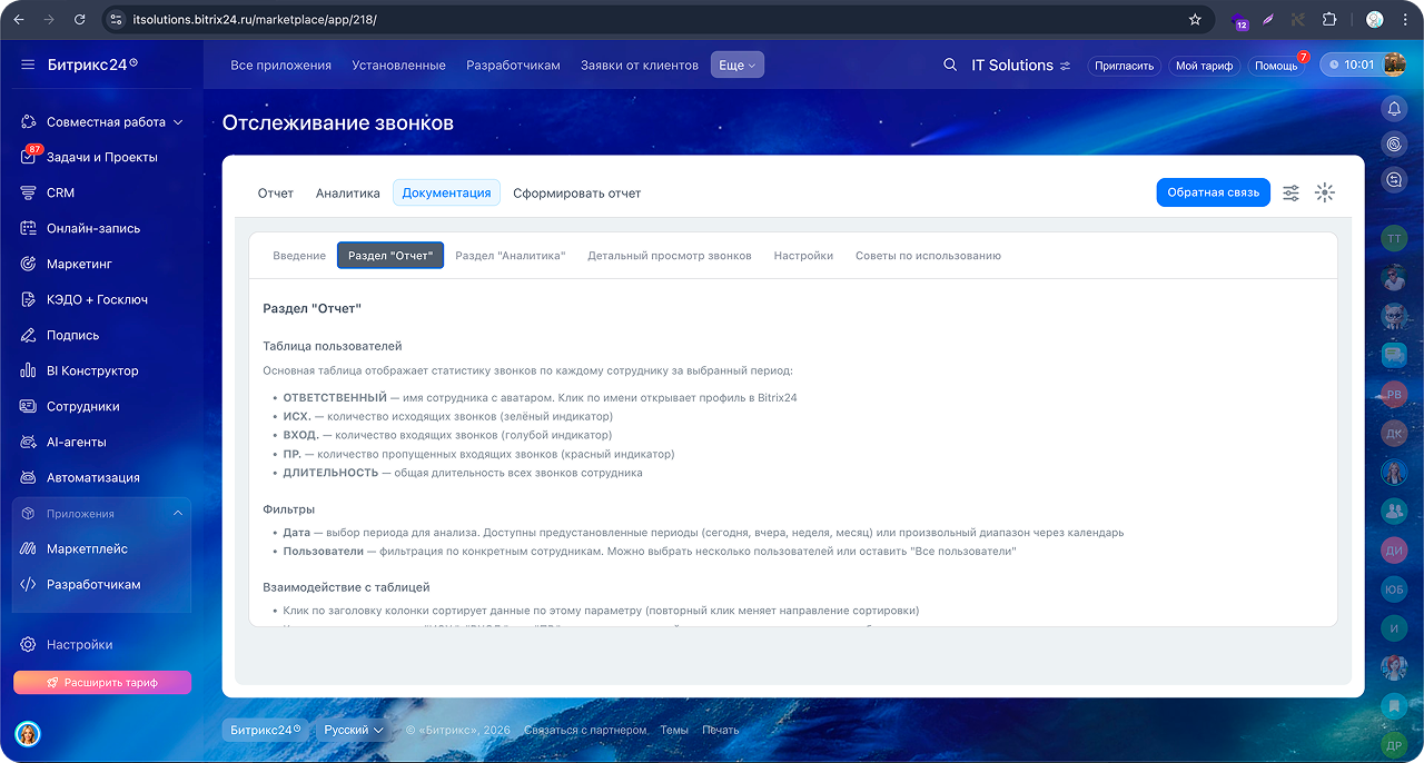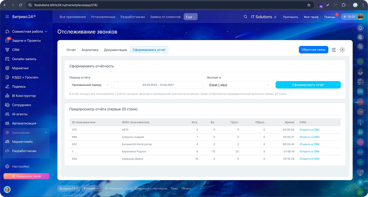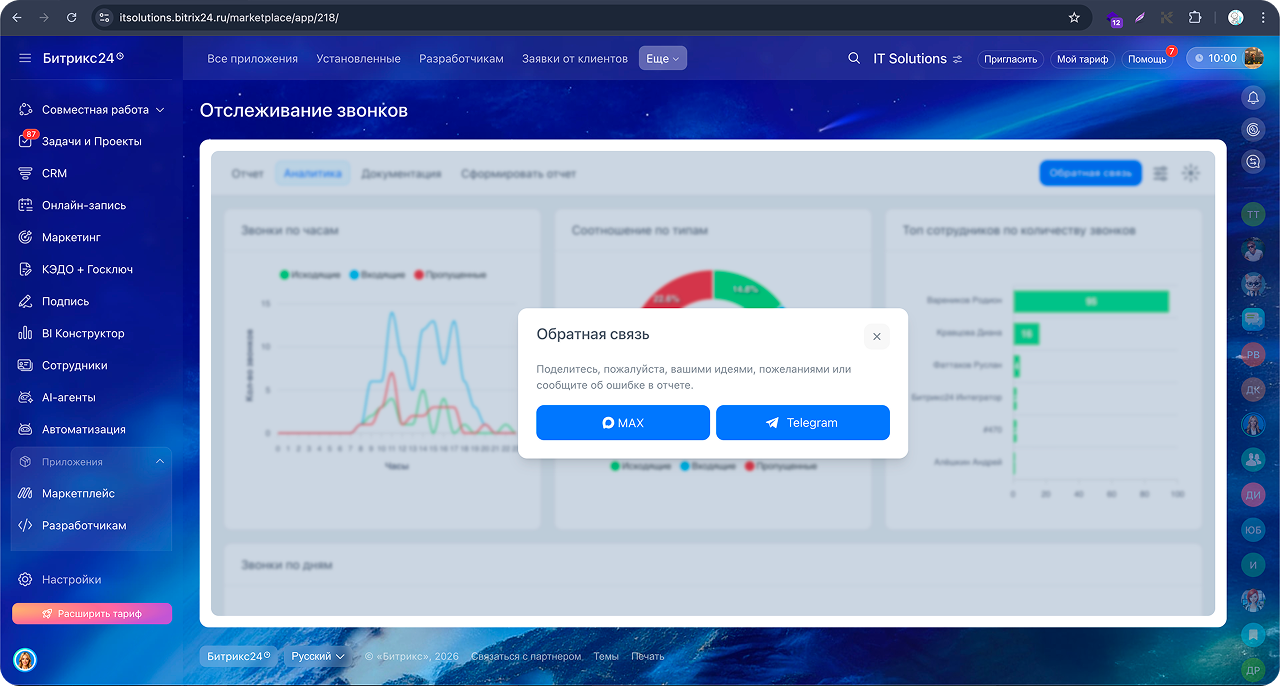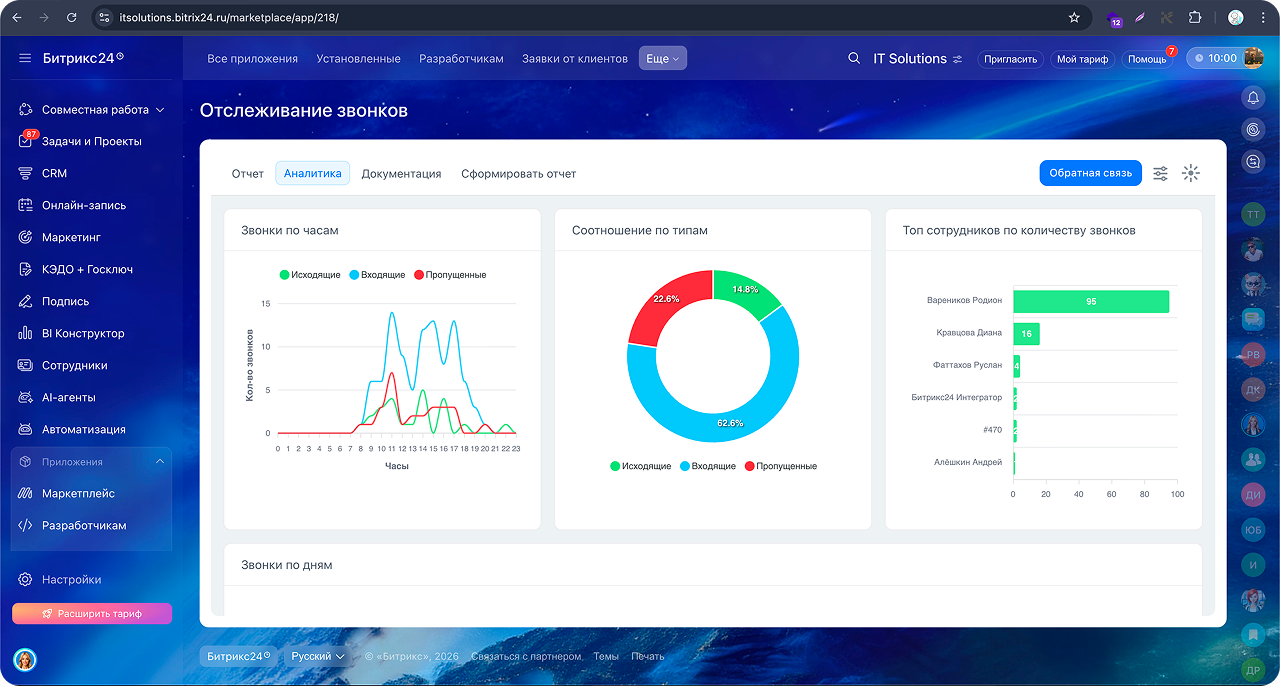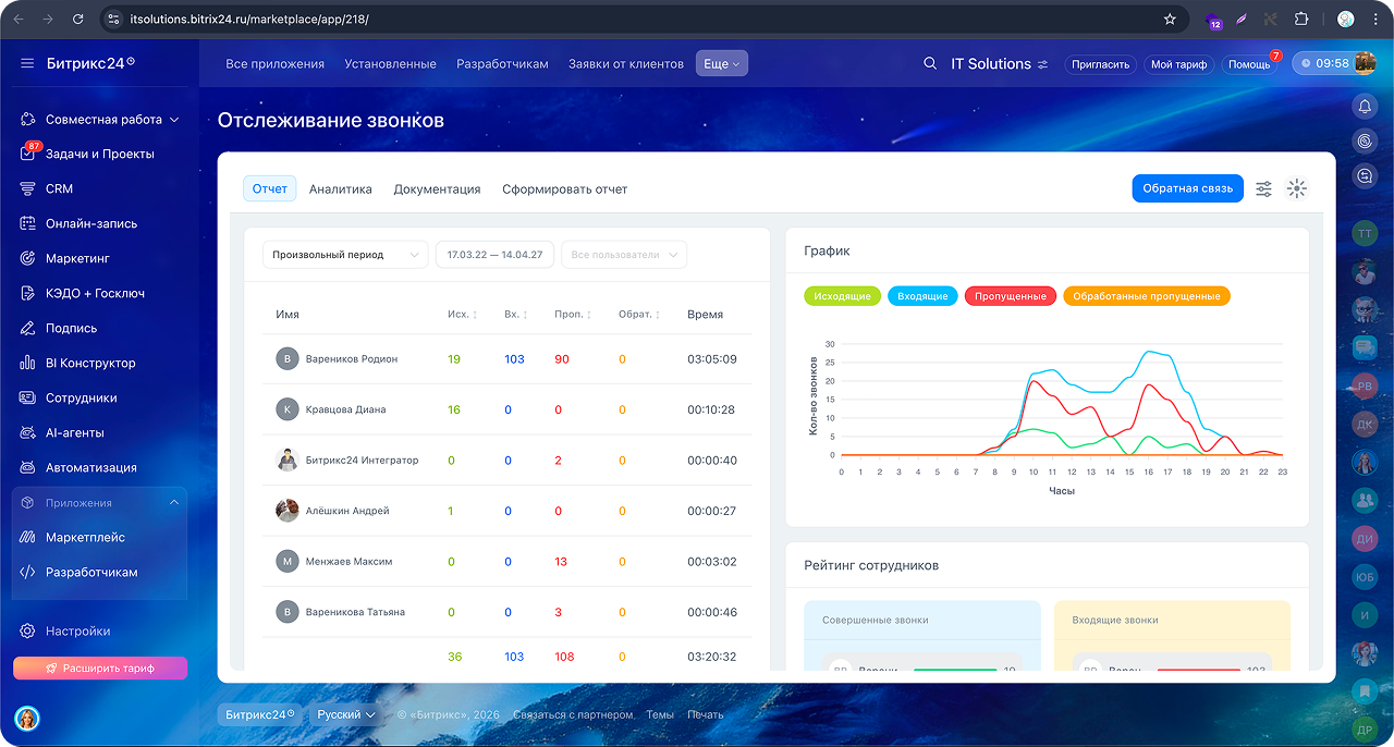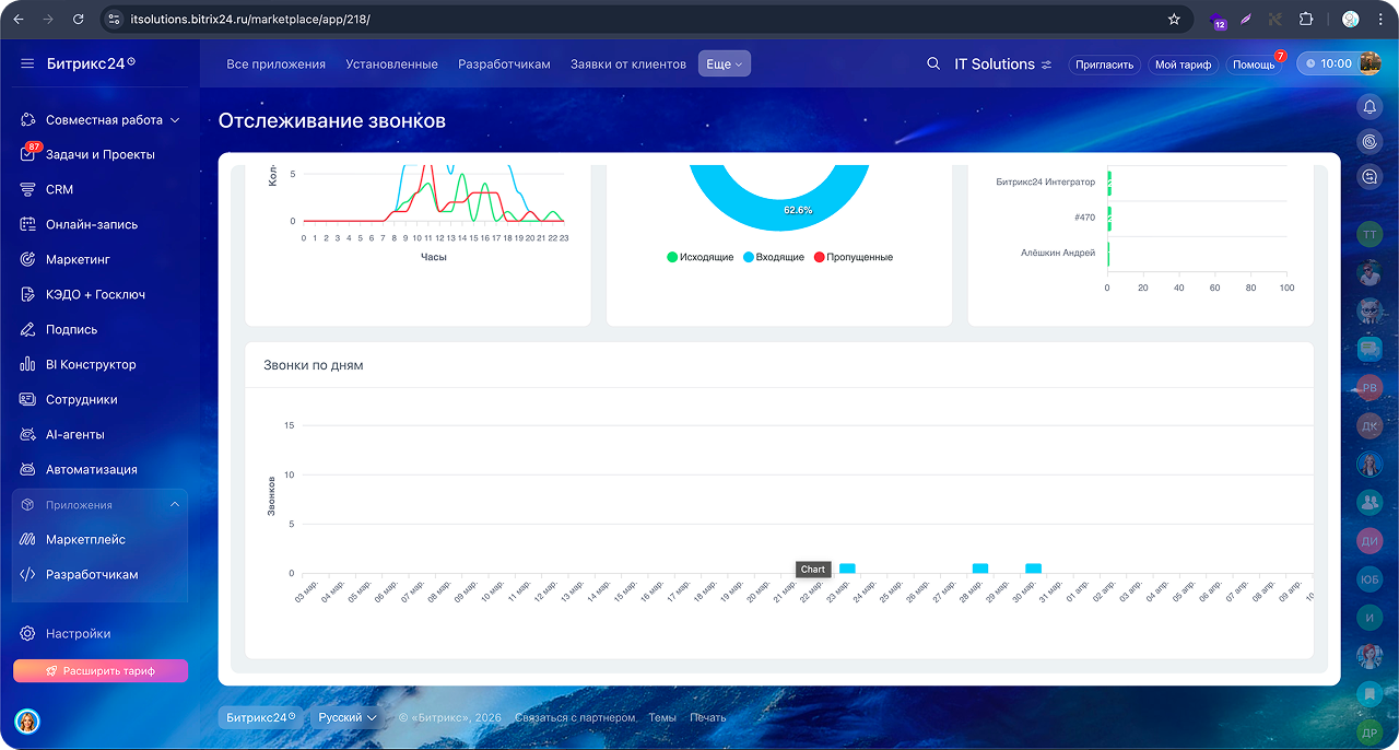 Приложение «Отслеживание звонков» собирает данные телефонии Bitrix24 и отображает их в удобном интерфейсе для анализа работы сотрудников.