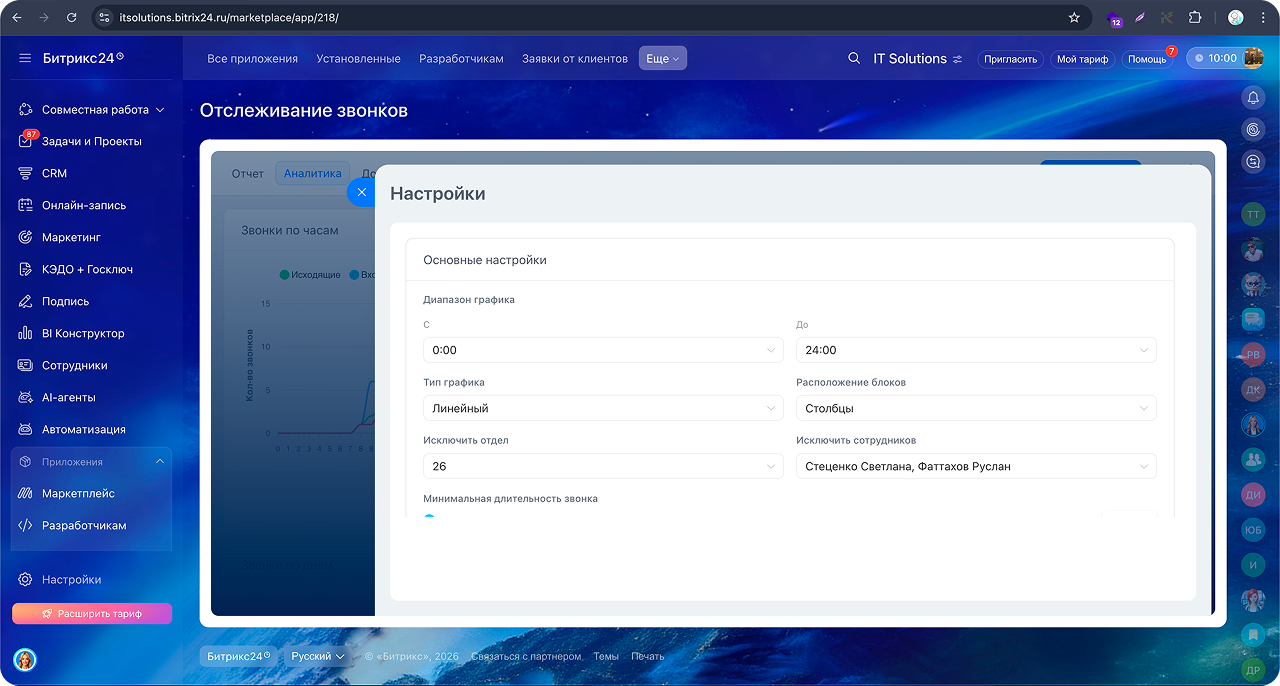 - Возможность исключать из аналитики отдельных сотрудников или целые отделы.