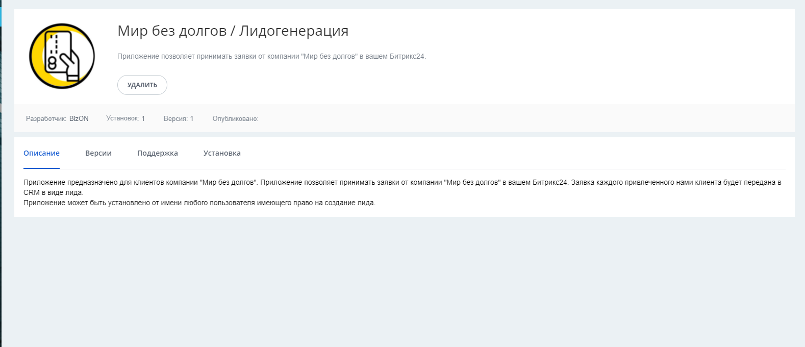 Приложение предназначено для клиентов компании "Мир без долгов". Приложение позволяет принимать заявки от компании "Мир без долгов" в вашем Битрикс24. Заявка каждого привлеченного нами клиента будет передана в CRM в виде лида.