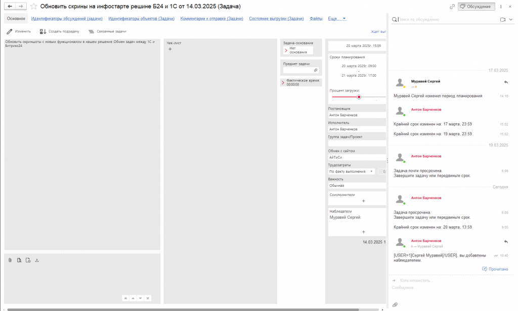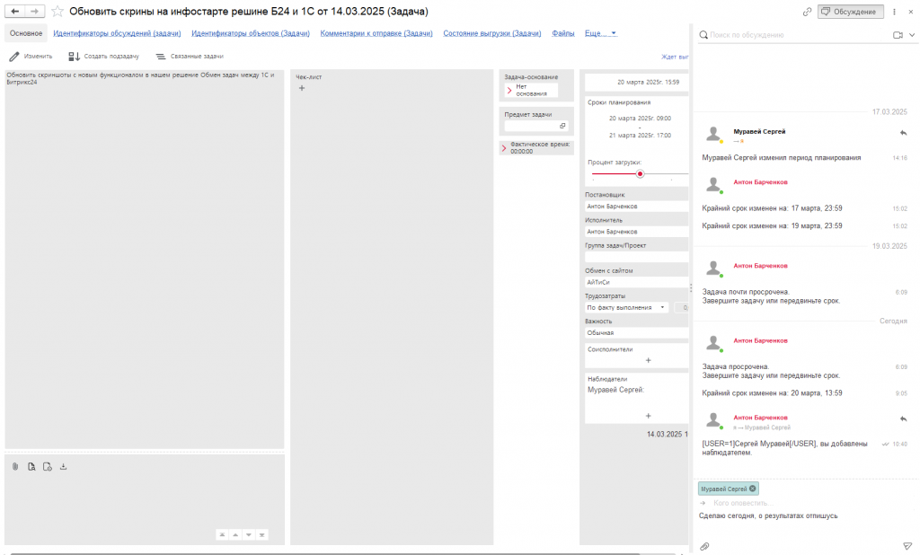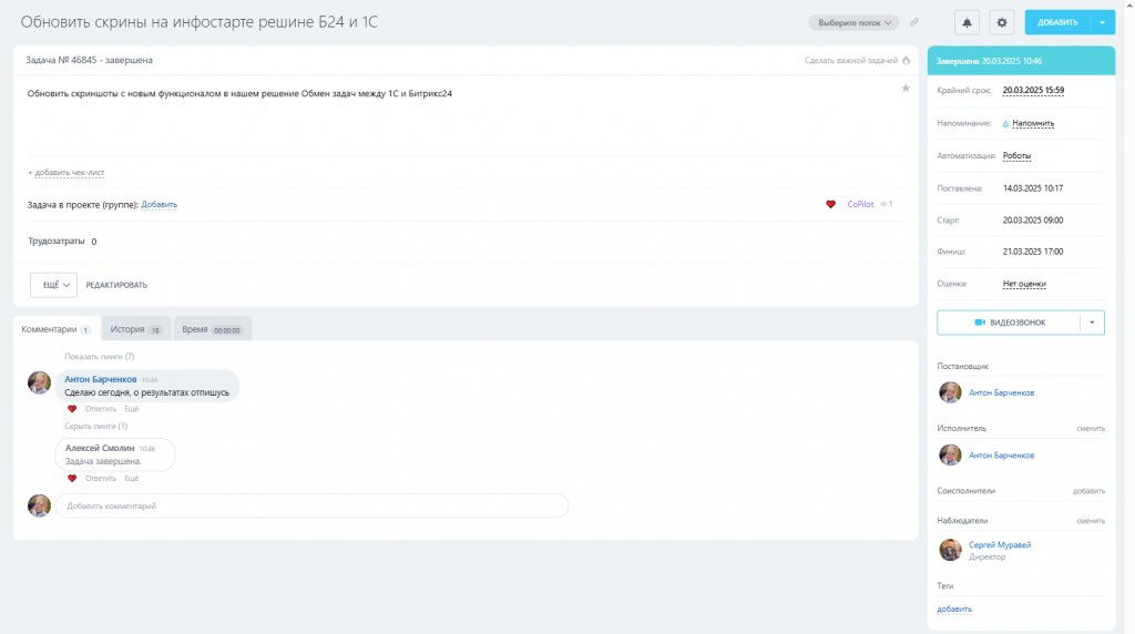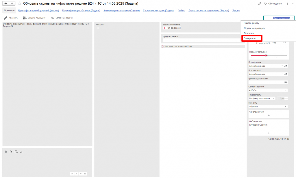 Далее можем закрыть задачу как и в Битрикс24, так и в 1С. Закроем задачу в 1С: