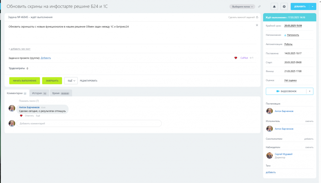 В 1С также можно менять задачу по тем параметрам, которые есть в Битрикс24. Напишем комментарий и отправим его, а также добавим соисполнителя: