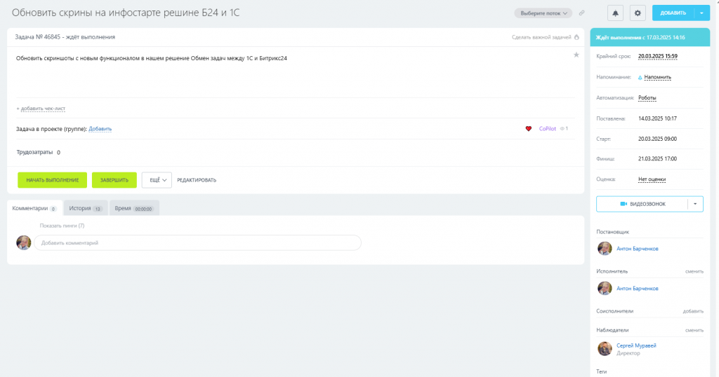 Видим, что со стороны Битрикс24 как комментарий, так и соисполнитель добавился:
