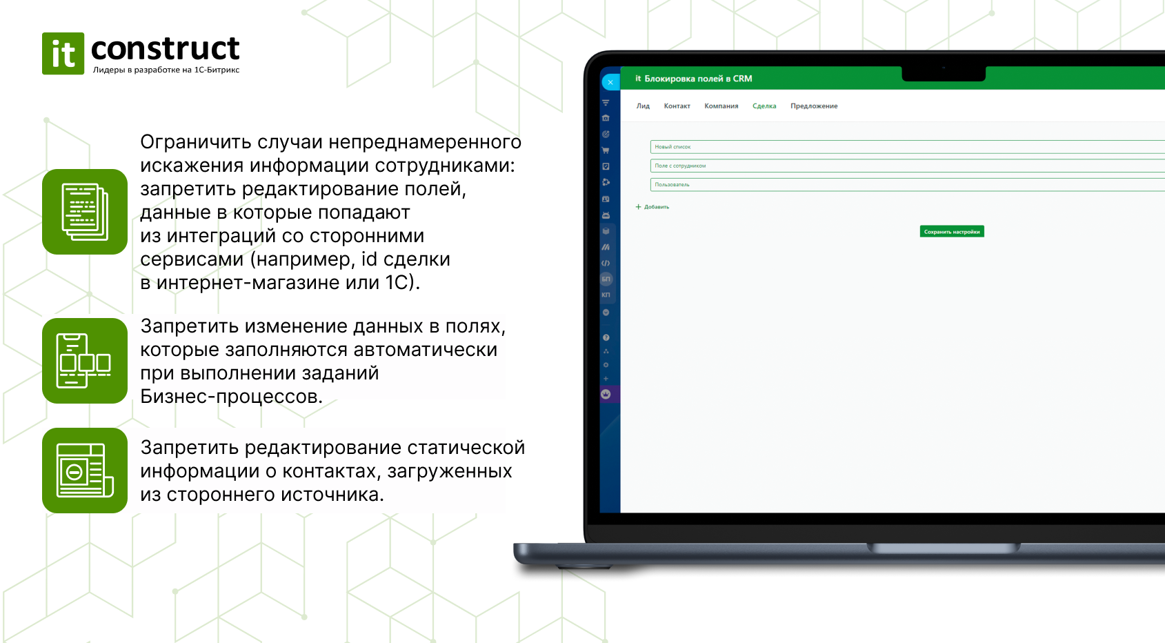 Данный модуль позволяет ограничить доступ к редактированию определенных полей в карточках контактов, компаний, сделок и других объектов CRM, за счет чего предотвращаются случаи непреднамеренного искажения информации.