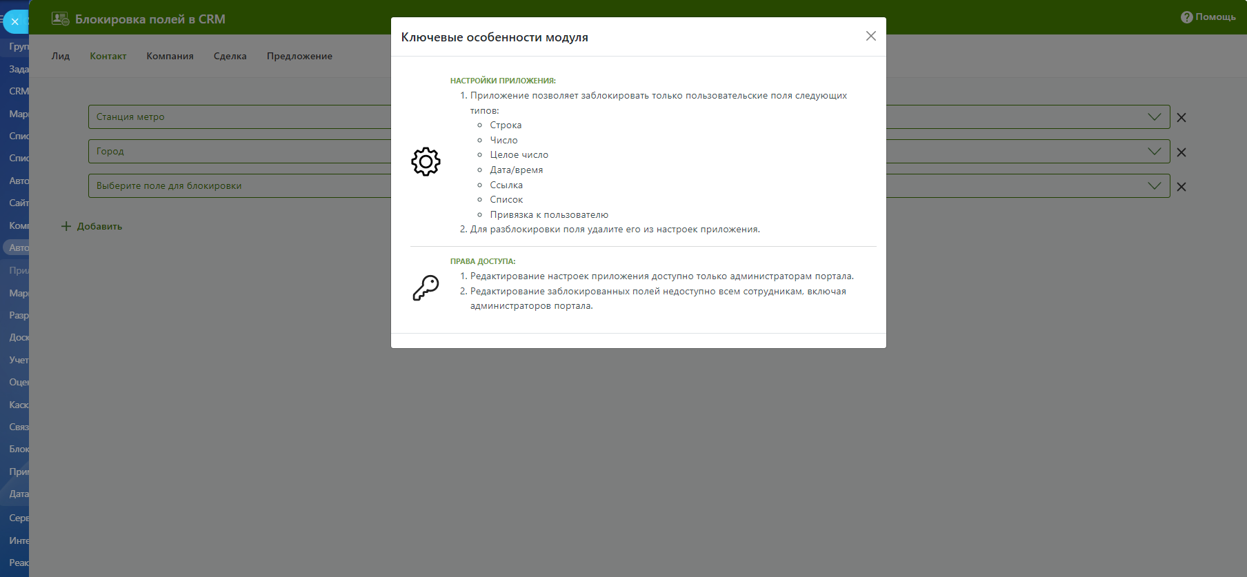 Приложение "Блокировка полей в CRM" - это решение для компаний, которые ценят безопасность и точность данных в своей CRM-системе.