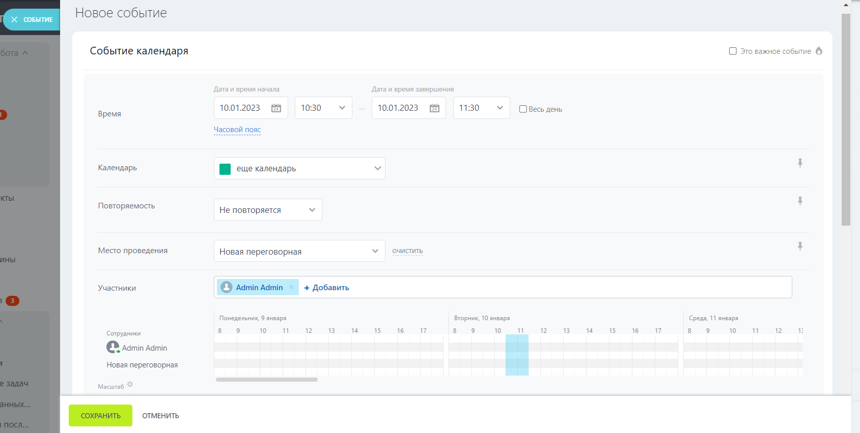- Учитывать тип занятости сотрудника в мероприятии (занят, свободен, отсутствует, под вопросом);