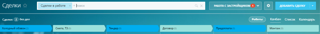 - Воронка для работы с застройщиком, включает этапы: Холодный обзвон; Смета, ТЗ; Тендер; Договор; Предоплата; Монтаж; Акты, финальная оплата.