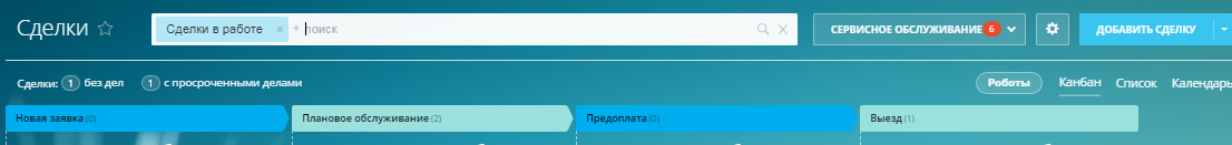 - Отдельная воронка для сервисного обслуживания, включающая этапы: Новая заявка, Плановое обслуживание, Предоплата, Выезд, Услуга оказана.