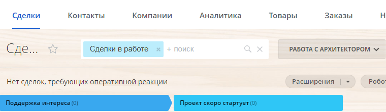 - Туннель продаж предназначен для автоматической связи двух направлений: «Работа с архитектором» и Продажа». Успешная сделка с архитектором автоматически формирует сделку в основной воронке.