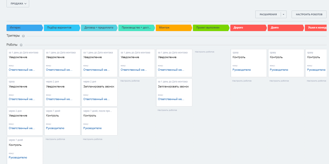 - Готовая воронка продаж со стадиями: Интерес; Подбор вариантов, Производство + доставка, Монтаж, Проект выполнен.