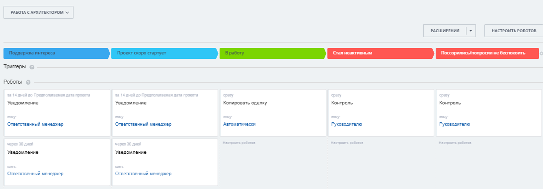 - после попадания сделки в одну из рабочих стадий, через 30 дней отправляются уведомления ответственному с напоминанием о необходимости работы с дизайнером/ архитектором;
