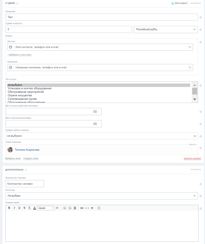 Если сделка была завершена успешно, система автоматически создаст новую сделку в направлении «Обслуживание оборудования».