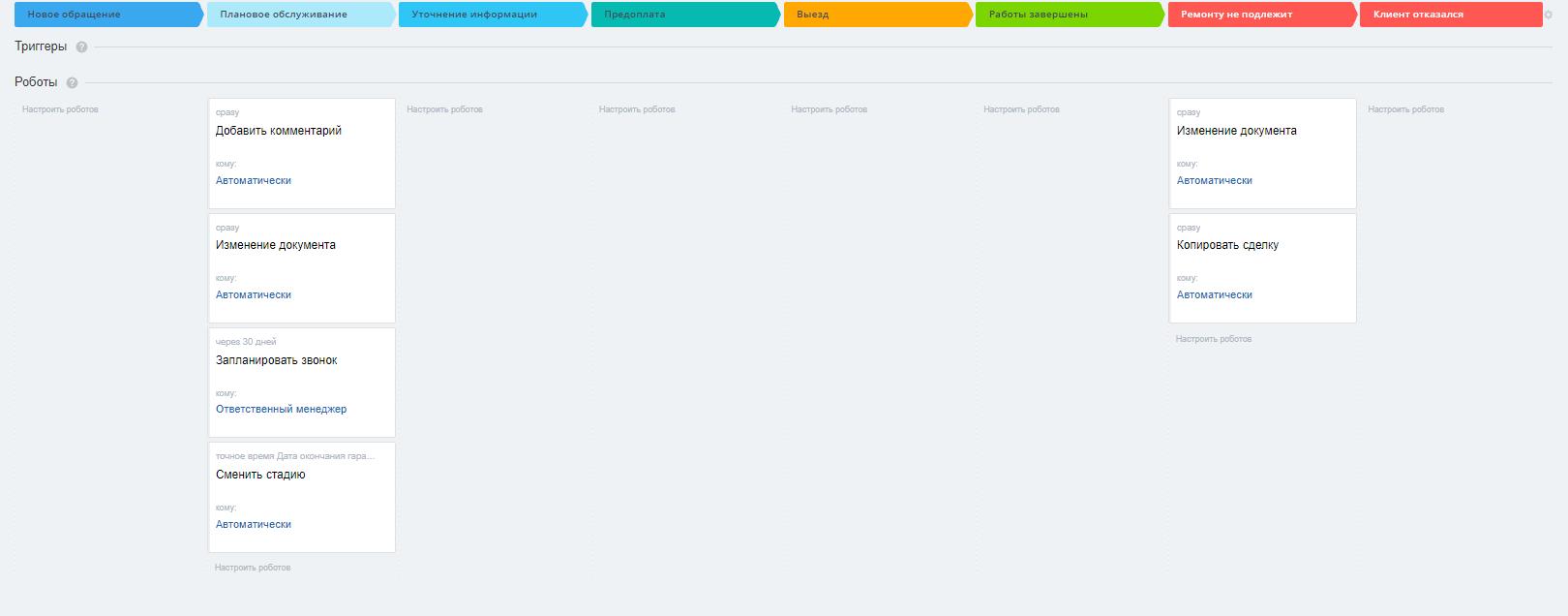 Воронка для сервисного обслуживания (гарантийных и не гарантийных работ), включающая этапы: «Новое обращение», «Плановое обслуживание», «Уточнение информации», «Предоплата», «Выезд», «Работы завершены».