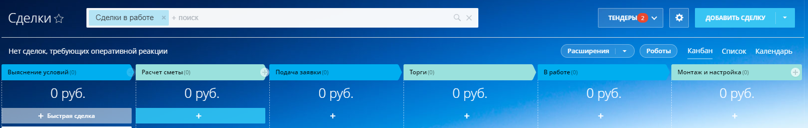 Воронка для работы с тендерами, включает этапы: Выяснение условий; Расчет сметы; Подача заявки; Торги; В работе; Монтаж и настройка; Акты и финальная оплата.