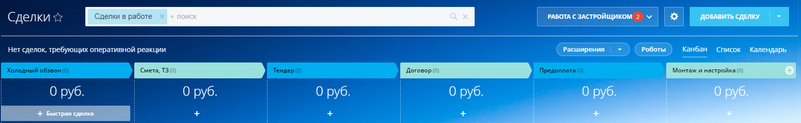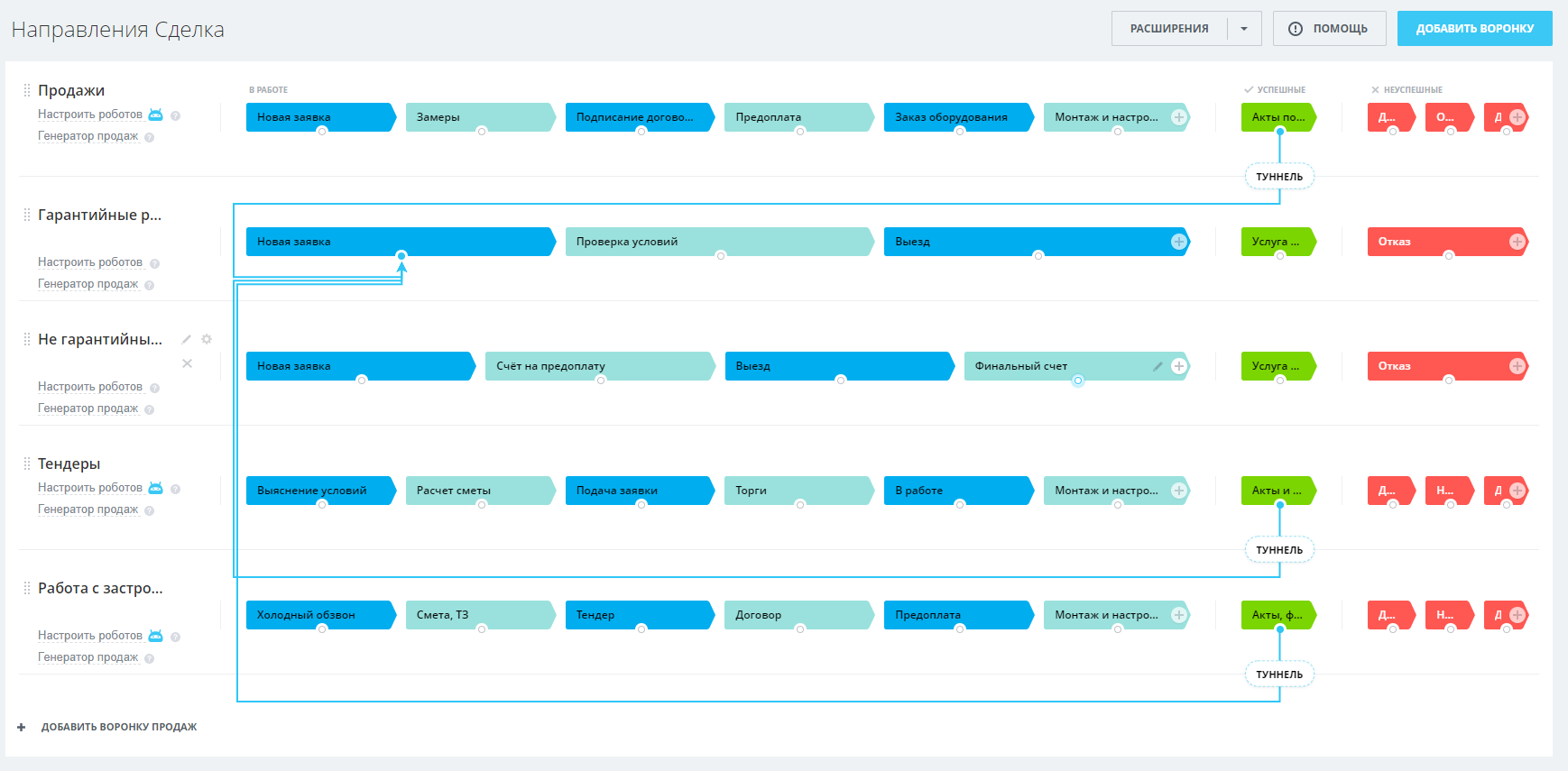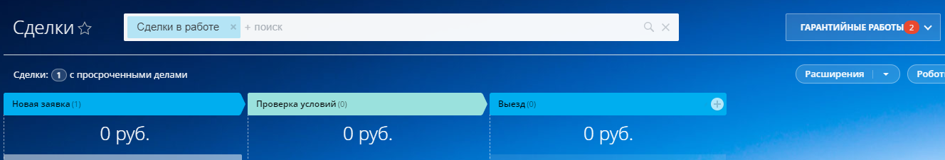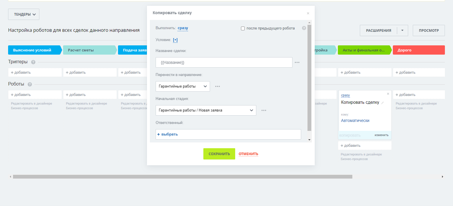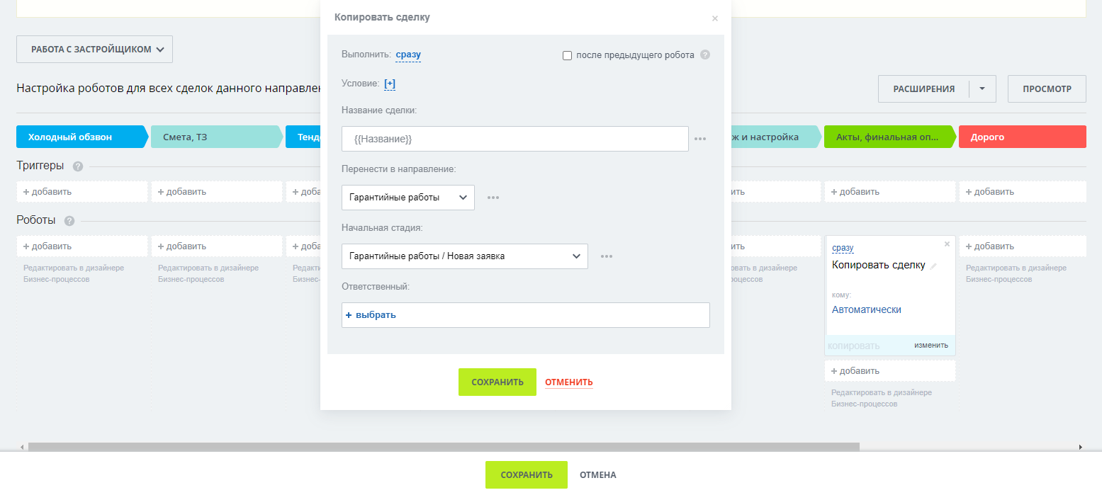 Настроенная связь направлений «Продажи», «Тендеры» и «Работа с застройщиком» с направлением «Гарантийные работы». Успешная сделка по каждому из перечисленных направлений автоматически попадает в воронку гарантийных работ на стадию «Новая заявка».