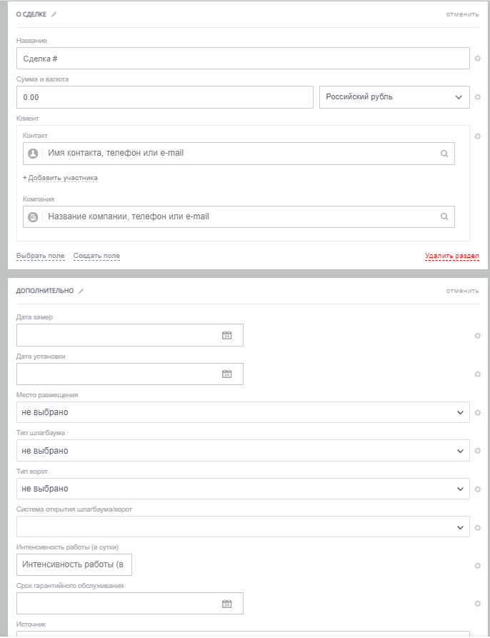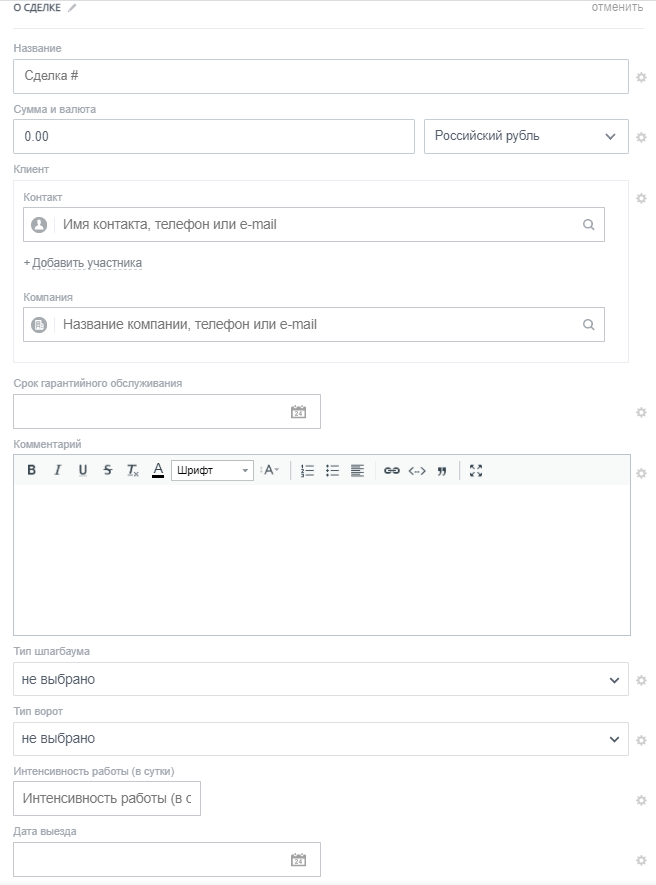 Карточка сделки для сервисного обслуживания состоит из полей: Название, Сумма, Клиент, Комментарий, Тип шлагбаума, Тип ворот, Интенсивность работы (в сутки), Дата выезда, Срок гарантийного обслуживания, Ответственный.