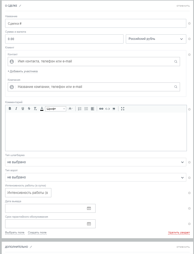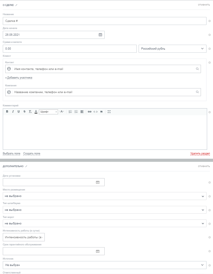 Карточка сделки для сервисного обслуживания состоит из полей: Название, Сумма, Клиент, Срок гарантийного обслуживания, Комментарий, Тип шлагбаума, Тип ворот, Интенсивность работы (в сутки), Дата выезда, Ответственный.