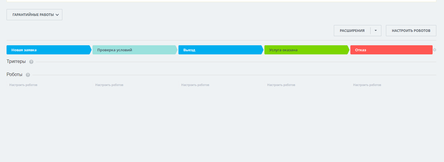 Отдельная воронка для сервисного обслуживания по гарантии, включающая этапы: Новая заявка, Проверка условий, Выезд, Услуга оказана.