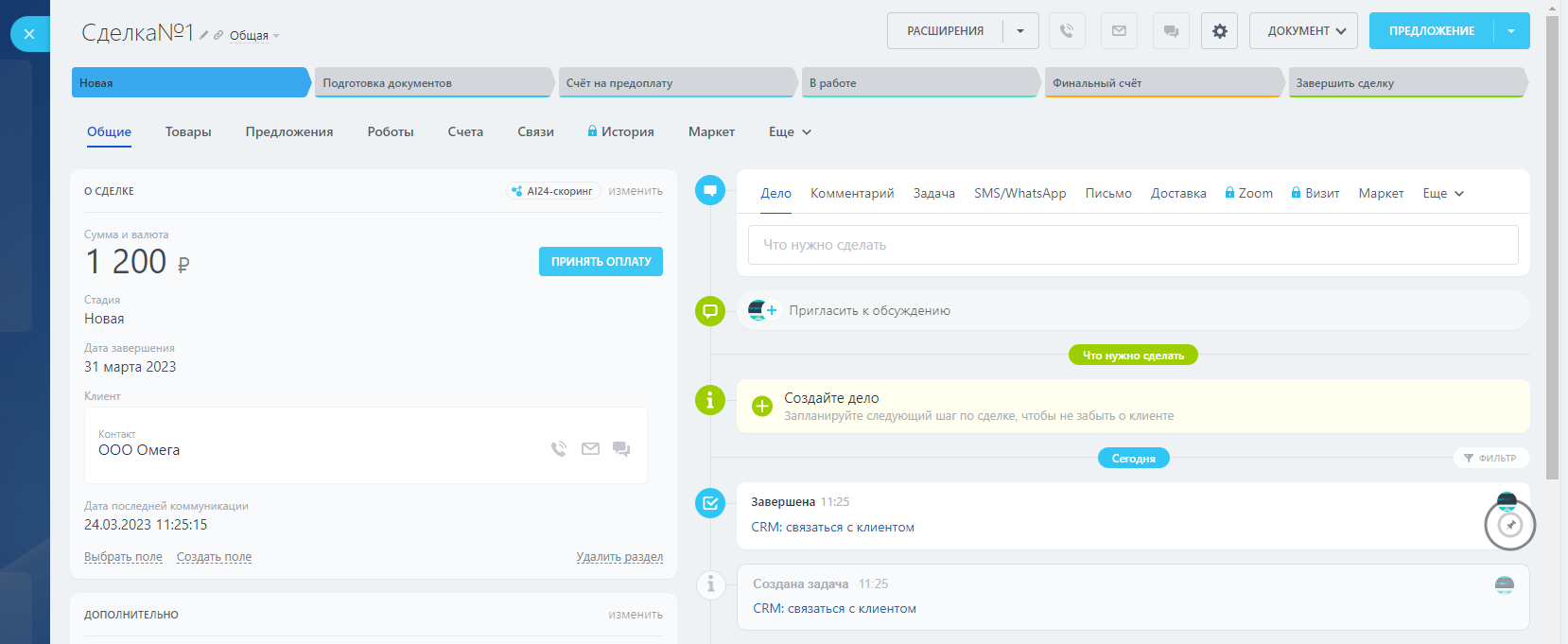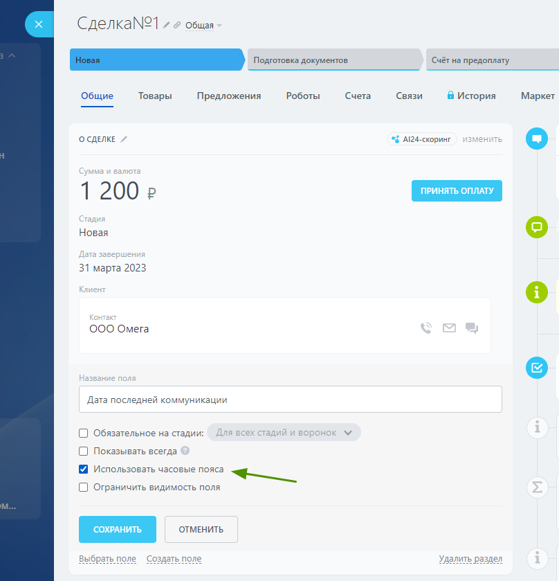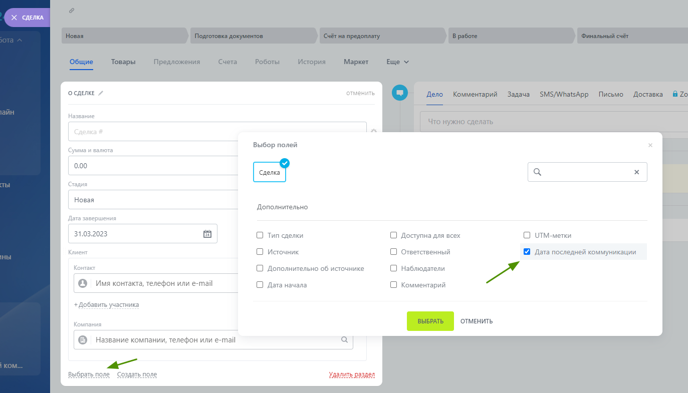 Больше, чем стандартное поле! Фиксируйте в CRM дату звонка нужной длительности, письма, встречи, задачи, дела и забронированные слоты