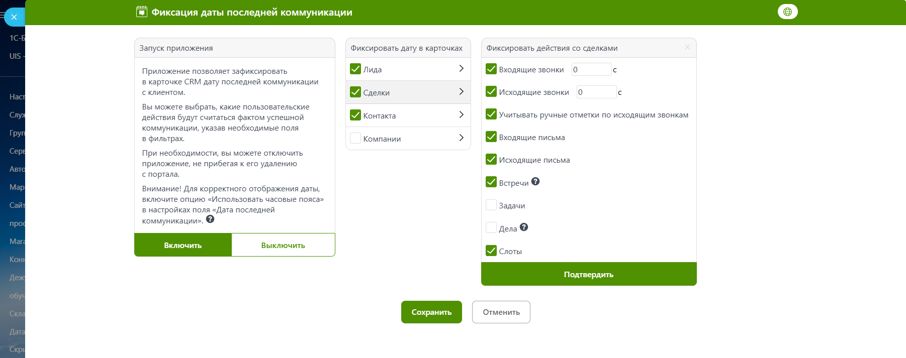 - возможность настройки отслеживаемых касаний для каждой отдельной сущности (Лида, Сделки, Контакта и Компании). К примеру, теперь приложение может фиксировать дату звонка в карточке Контакта, а дату задачи и встречи - в карточке Сделки.