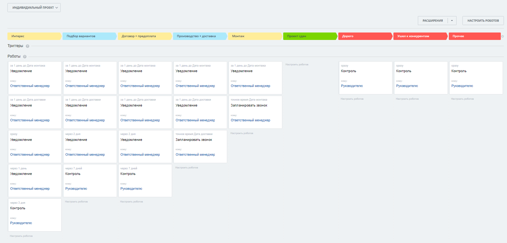 - Туннель продаж предназначен для автоматической связи двух направлений: «Индивидуальный проект» и «Работа с архитектором». Успешная сделка с архитектором автоматически попадает в основную воронку.