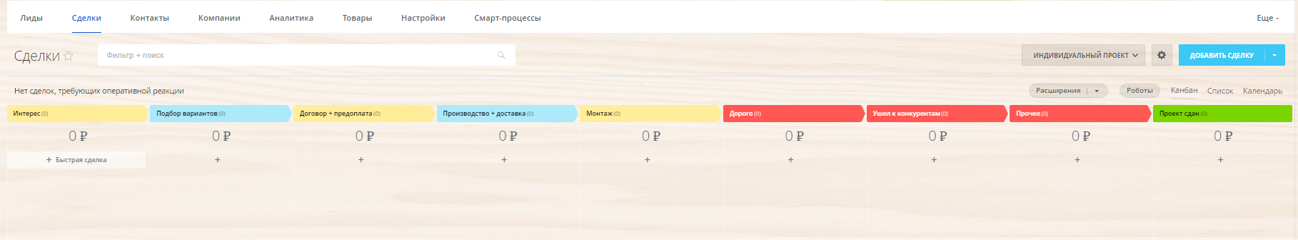 - Карточки сделок для основного направления «Индивидуальный проект» со специальным блоком Проект. Он содержит поля для вашего бизнеса: Дата начала, Макет проекта и Замеры с возможностью загрузки файлов.