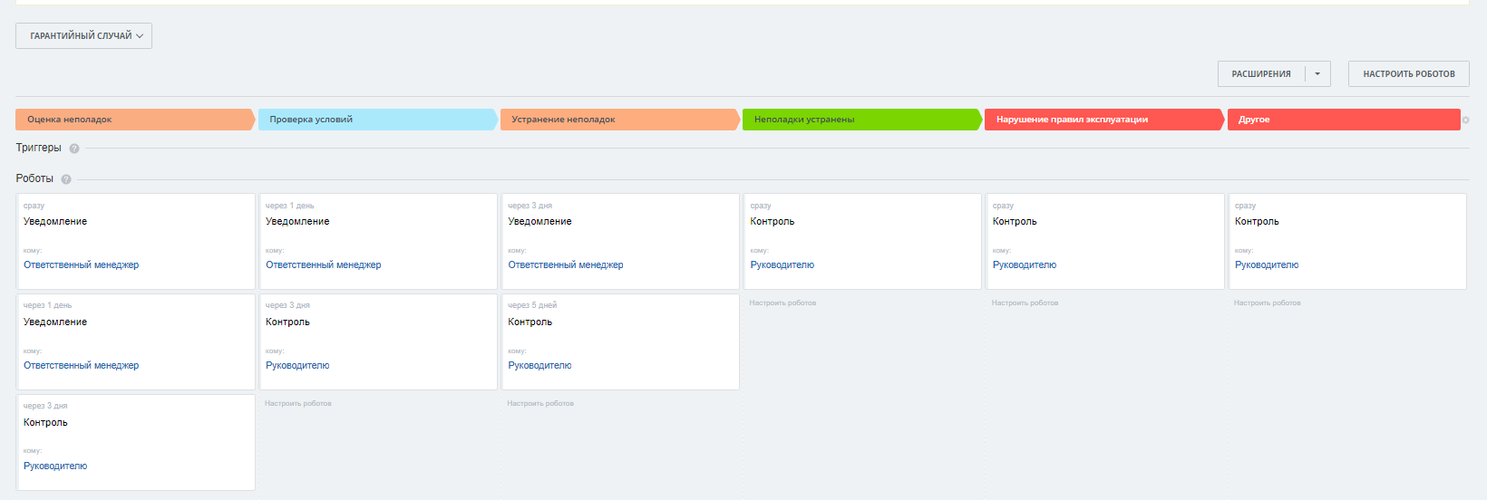 - Отдельная воронка для работы с гарантийными случаями, включающая этапы: Оценка неполадок, Устранение неполадок, Передача актов выполненных работ.