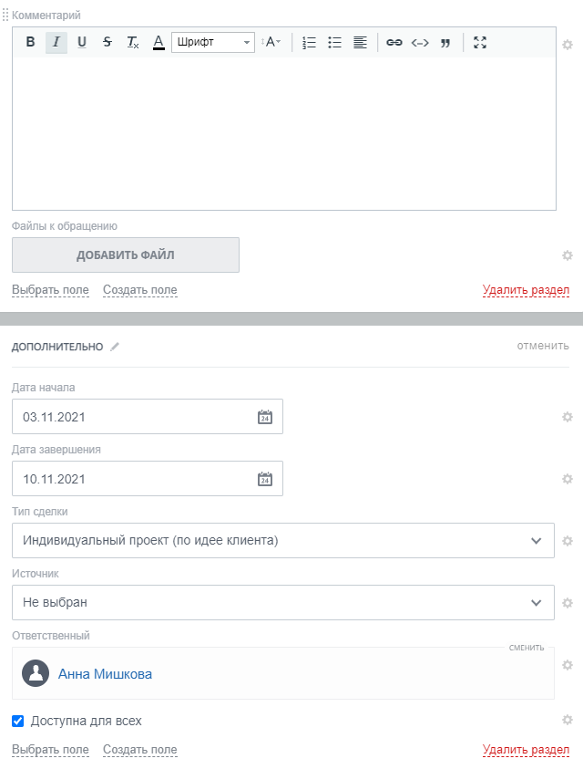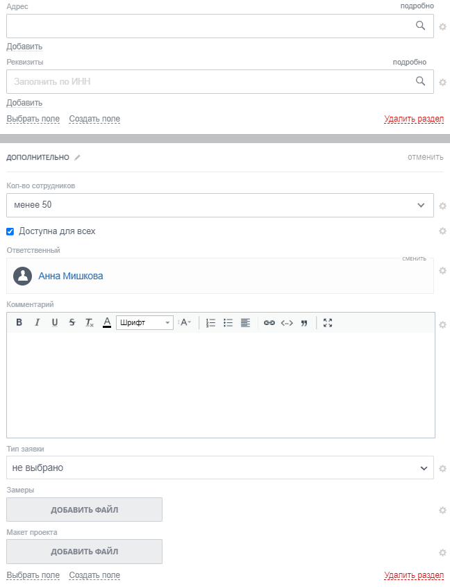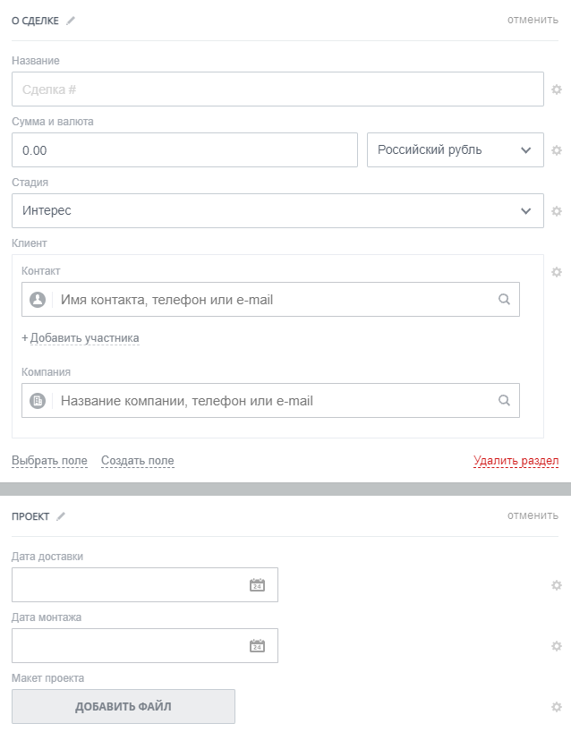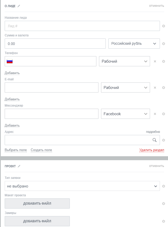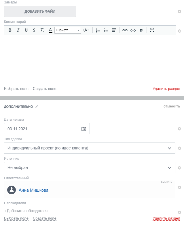 - Карточки сделок для основного направления «Индивидуальный проект» со специальным блоком Проект. Он содержит поля для вашего бизнеса: Дата начала, Макет проекта и Замеры с возможностью загрузки файлов.