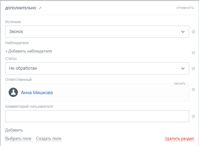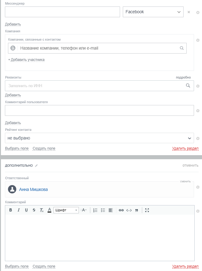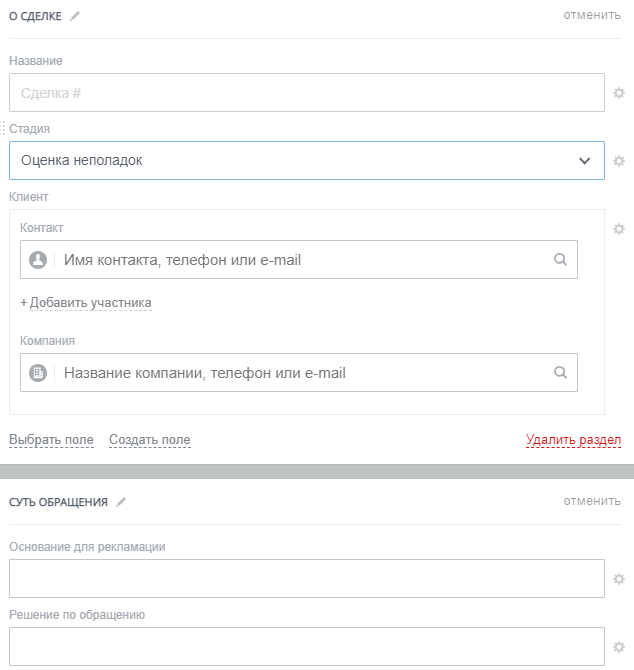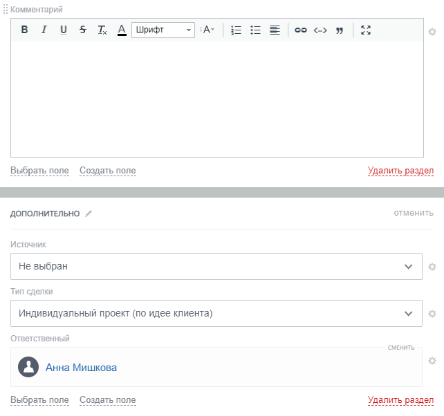 6. Внесение базовой информации о мебели на заказ в едином формате благодаря настроенным полям в карточках сделок.