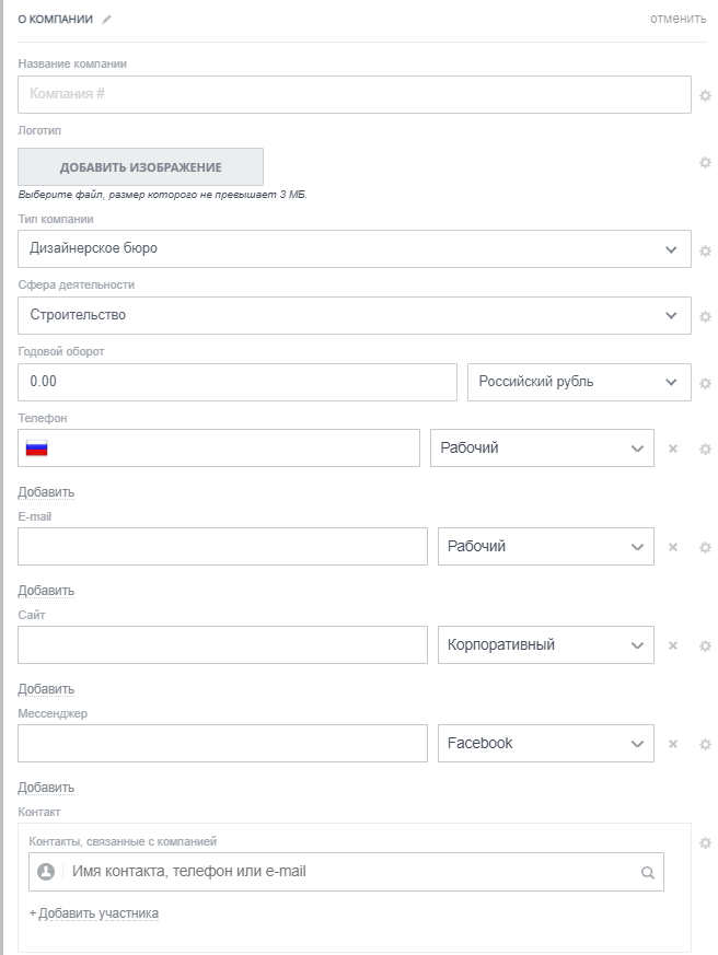 - Заранее настроенные типы компаний: Дизайнерское Бюро, Строительная компания, Транспортные услуги (грузоперевозки), Партнер.