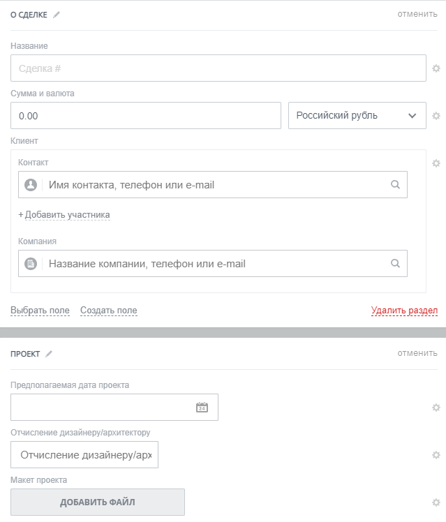 - Карточки сделок для направления «Работа с архитекторами» со специальным блоком Проект. Он содержит поля: Дата начала, Макет проекта и Замеры с возможностью загрузки множества файлов.